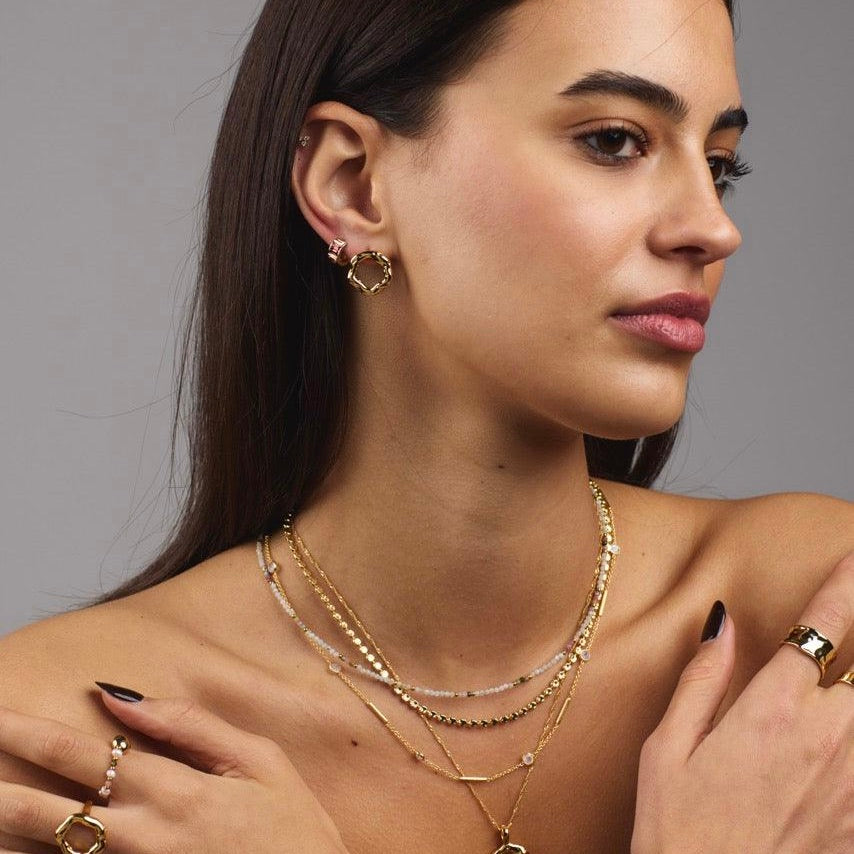 A charming accessory that combines the comfort of a huggie earring with the dazzling beauty of crystals. These huggie earrings feature variants of rouge-coloured crystals, adding a touch of vibrant colour and sparkle to your earlobe. The Kira Huggie earrings are designed to comfortably hug your ear, making them perfect for everyday wear or special occasions. With their versatile and eye-catching design, these earrings effortlessly elevate any ensemble.