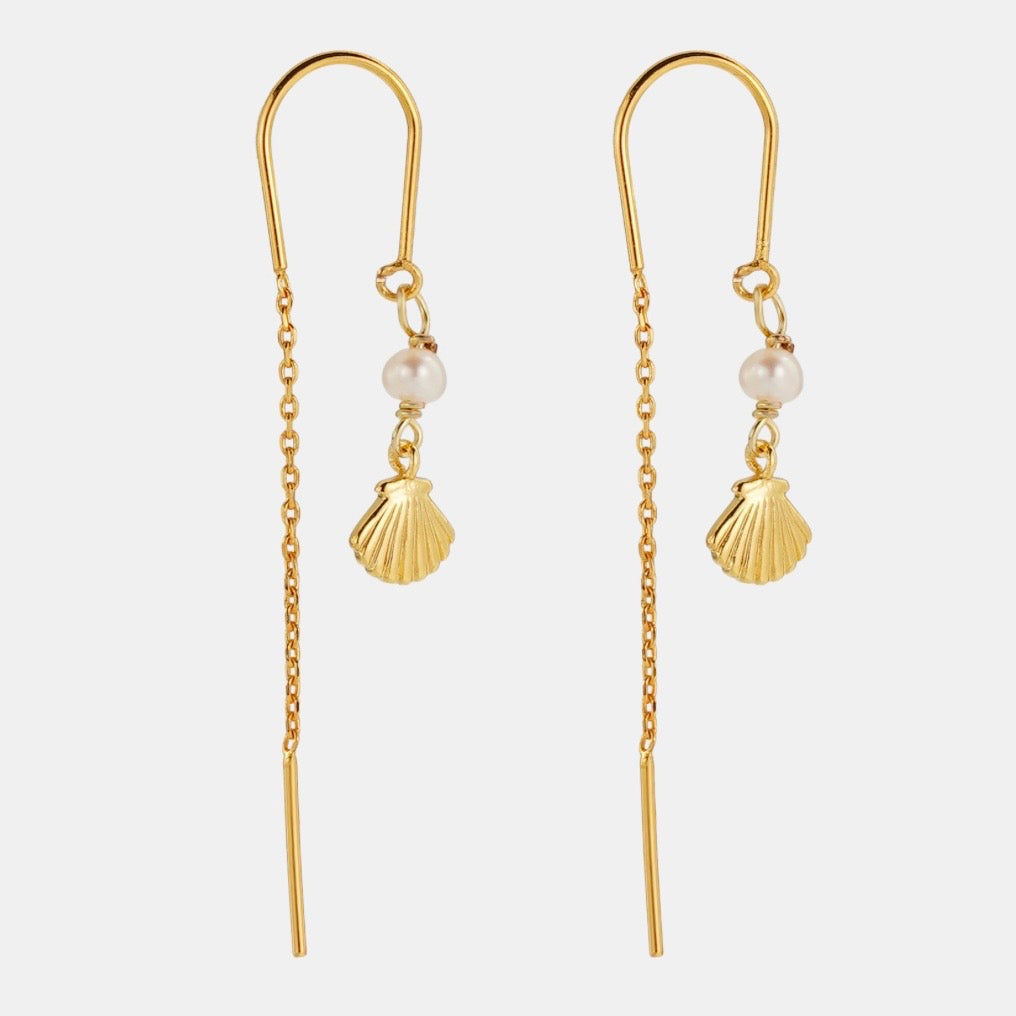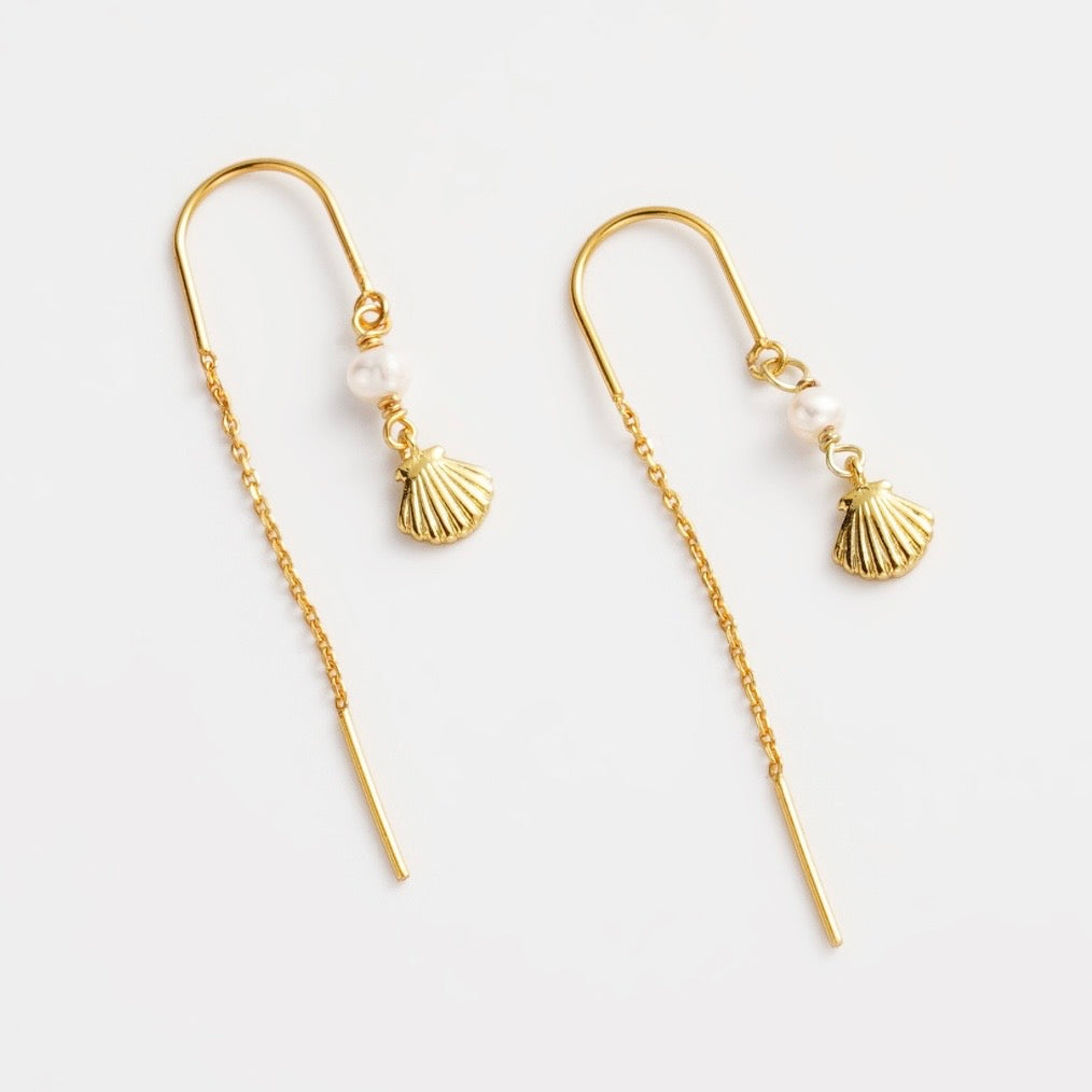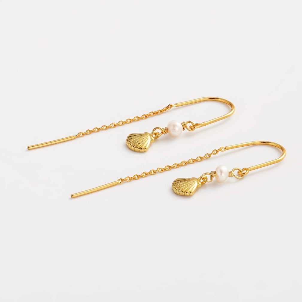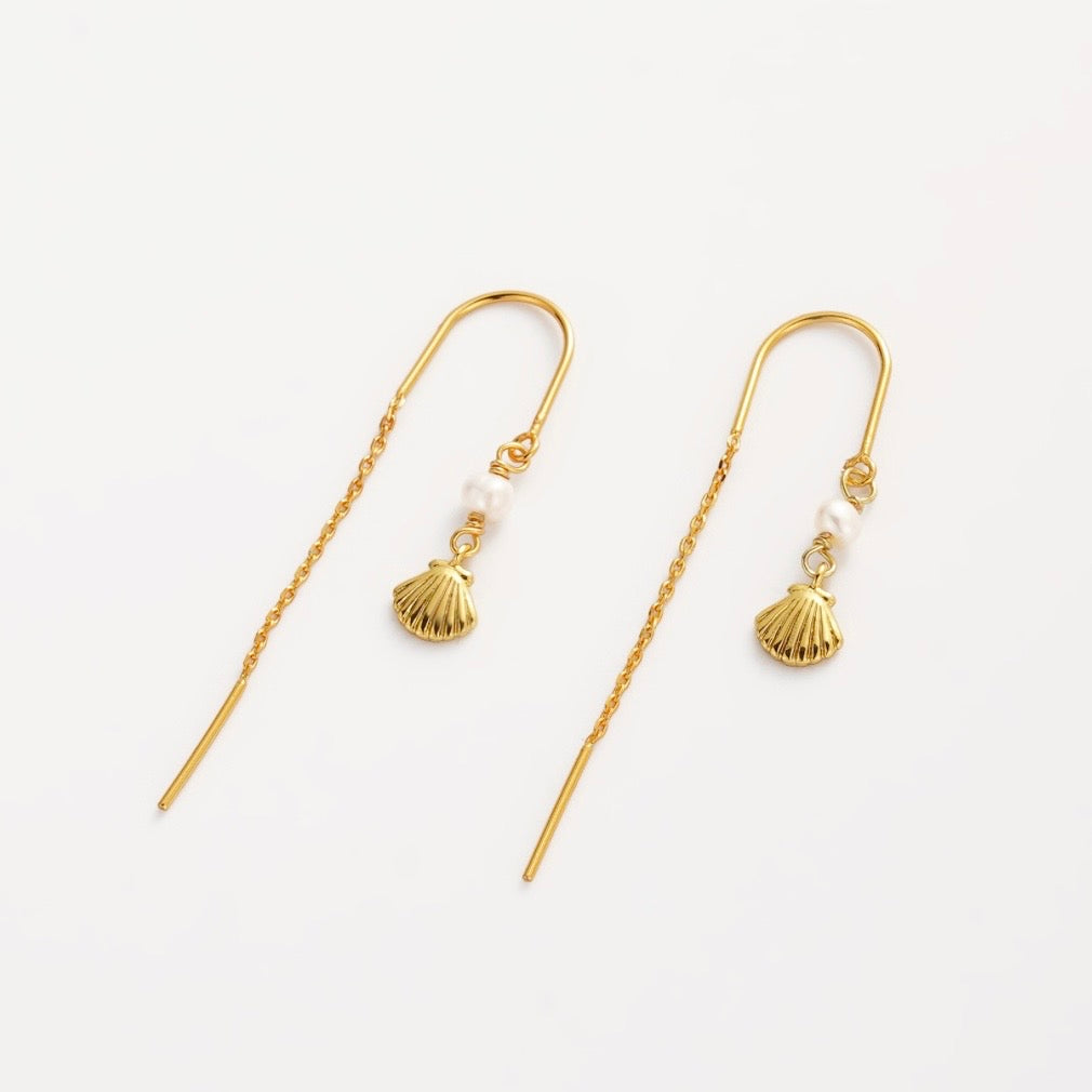 Each delicate chain threads gracefully through the ear, finished with a tiny shell charm and petite freshwater pearls that shimmer with every movement. Lightweight and feminine, they bring a touch of coastal sophistication — perfect for both everyday wear and special summer moments.