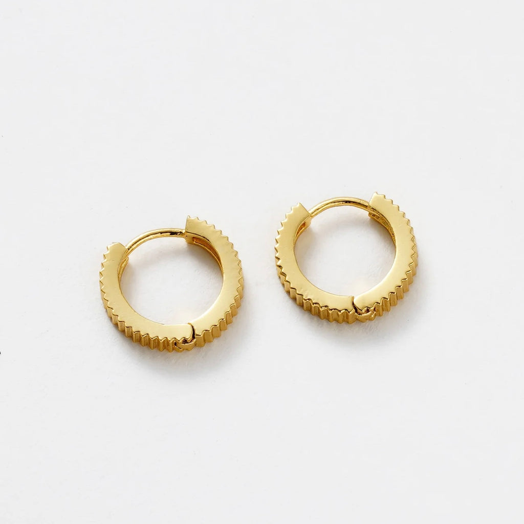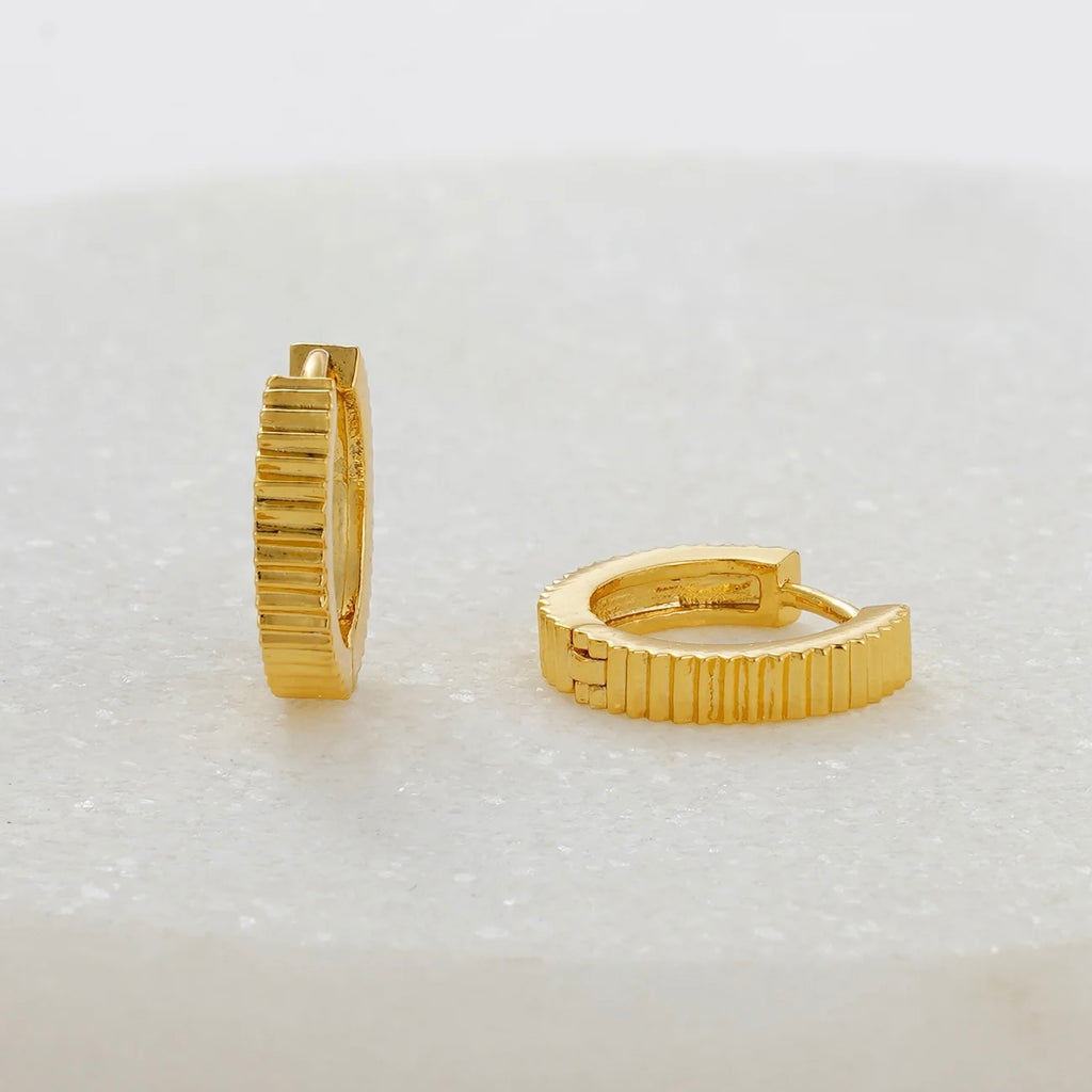 A modern twist on a classic hoop, the Willow Huggie features a refined ribbed texture and a high-shine gold finish. Effortlessly versatile and perfect for everyday wear, this piece adds subtle edge and sophistication to any ear stack.