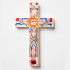 A rising sun framed in pink and red radiance. The Fable Pink Sun Large Cross is painted by hand with a stylised folk motif and bursts of colour, symbolising hope and renewal. Lightweight and luminous, it hangs like a beam of warmth.