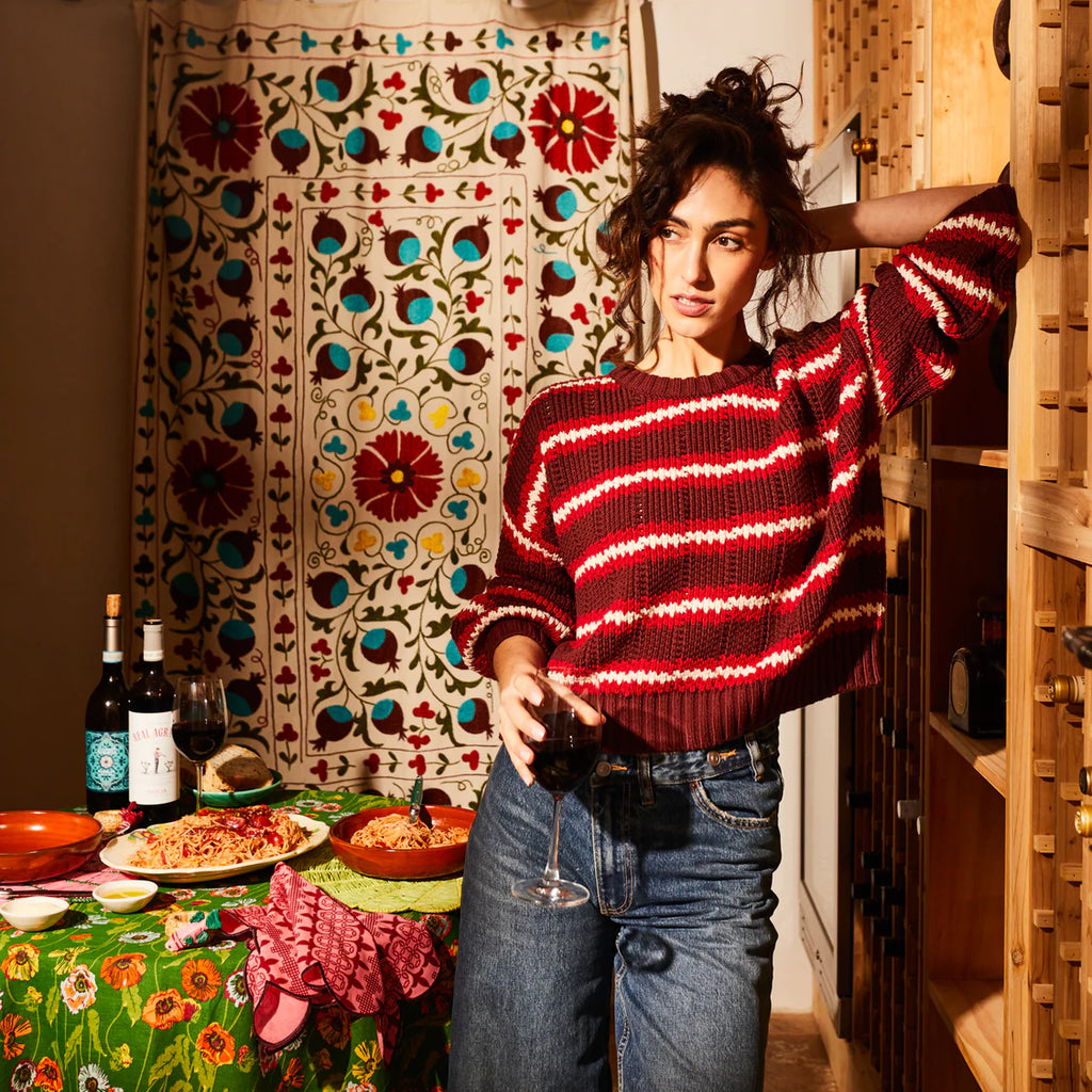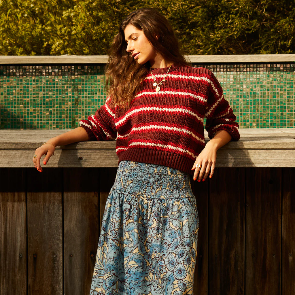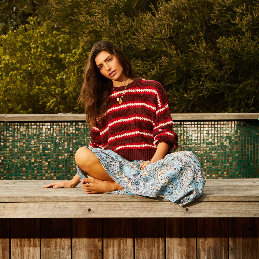 Slip into laid-back style with this slouchy knit jumper, blending all-day comfort with a touch of retro charm. With nostalgic stripes and a relaxed fit, it’s perfect for layering over bathers or wide-leg pants. Just add slides or denim for that effortless, throw-on-and-go feel.
