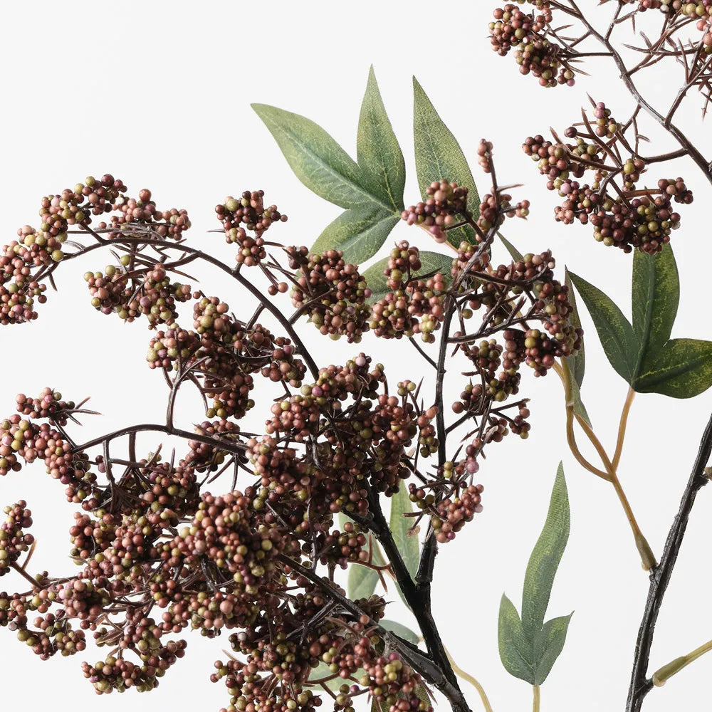 Bring the garden indoors with this stunning artificial pepper berry spray, unbelievably realistic it will feel like you have just been to the market and picked a fresh bunch. Easily maintained this beautiful faux berry spray will bring lasting beauty into your home. Create a one of a kind artificial arrangement mixing with other stems or place in one of our decorative vases on its own.