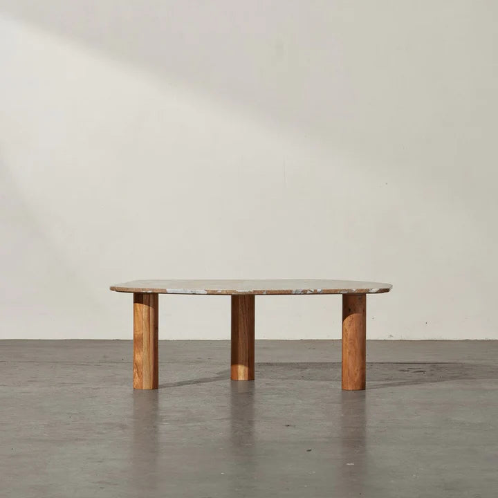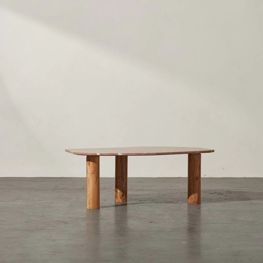 Indulge in the captivating allure of the Clifton Table, a marble top coffee table that exudes luxury and sophistication. Its unique irregular shape, characterized by organic smooth lines and a rounded rectangular silhouette, adds a touch of artistic charm to your living space. The Clifton Table stands on three column-shaped wooden legs, providing both stability and a visually intriguing design element. These warm coloured wooden legs perfectly complement the exquisite tones in the marble top, creating a harmonious fusion of materials and textures. Choose from two stunning tabletop finishes: red alicante or grey lagoon. Each option showcases its own distinctive beauty of the natural stone, allowing you to select the one that best complements your interior style and creates a captivating focal point in your space. The Clifton Table can be coupled with the slightingly taller Waverly Table, creating a cohesive and stylish pairing that elevates your interior decor.