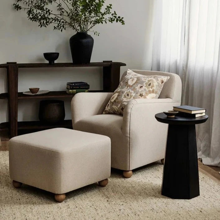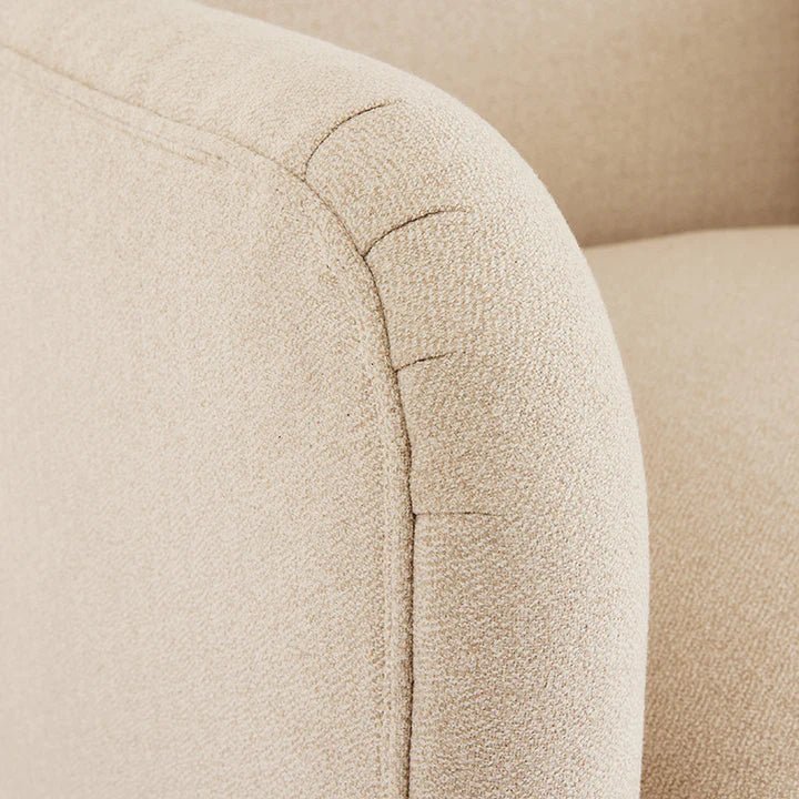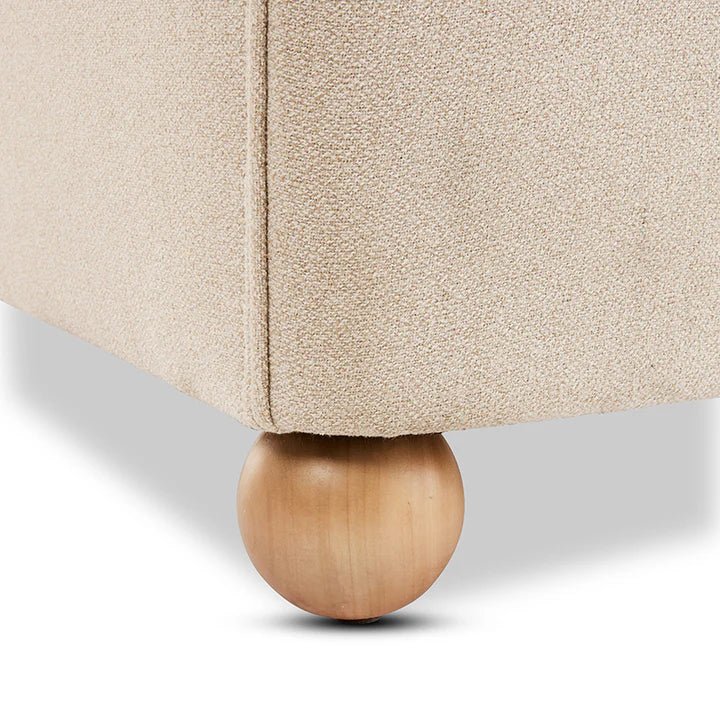 Introducing the Floyd Natural Chair! Experience luxurious comfort with the soft beige fabric and curved design. The oak wood spherical feet add a touch of elegance to any room. Elevate your space with this must-have chair.
