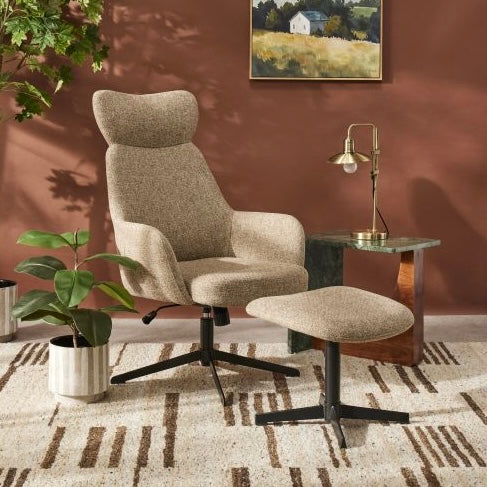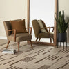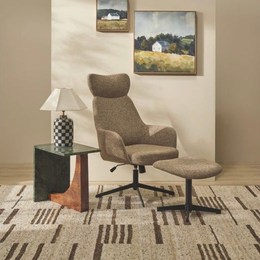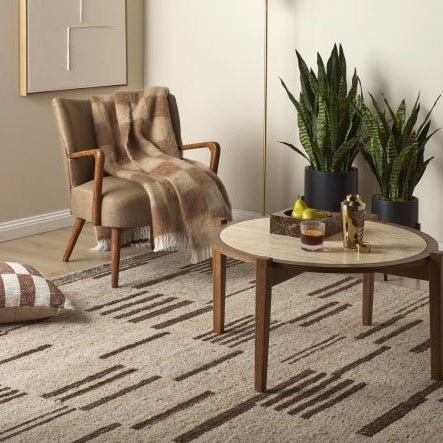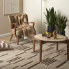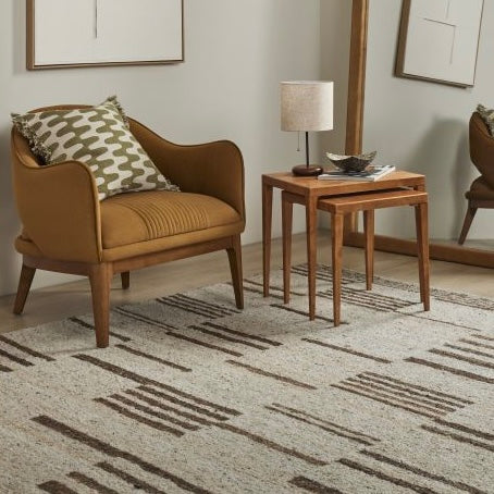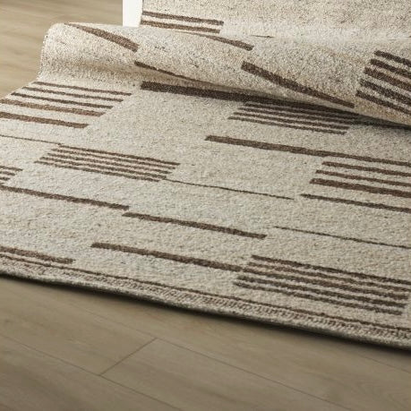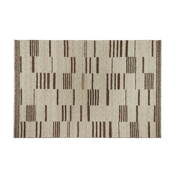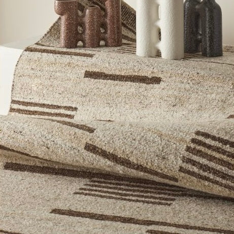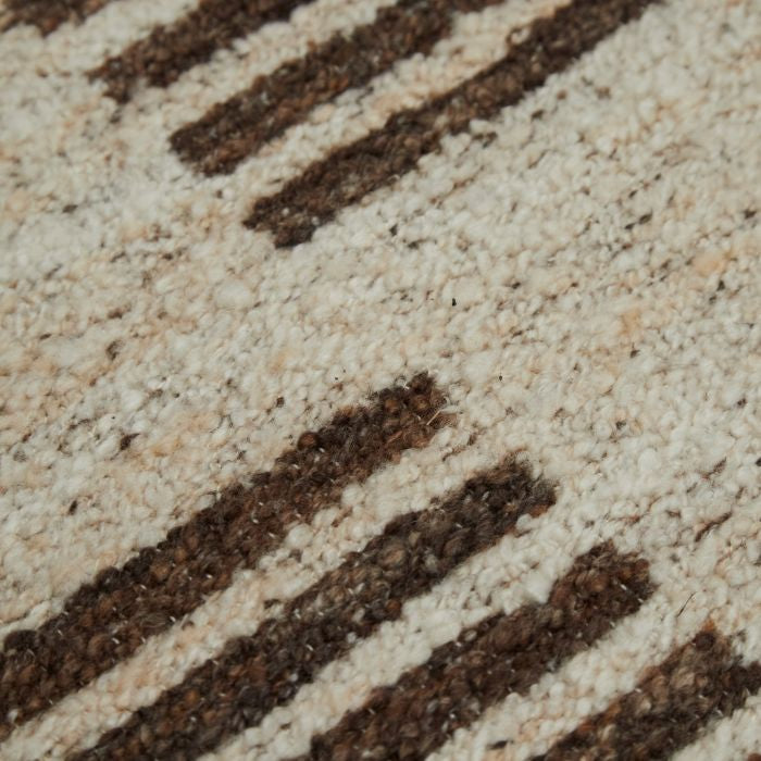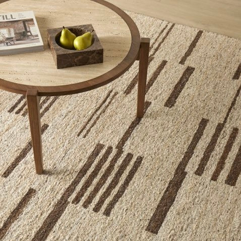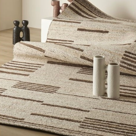 This Bronte Rug is crafted from polyester in light and dark browns using a high/low pile technique to create softness and variation.