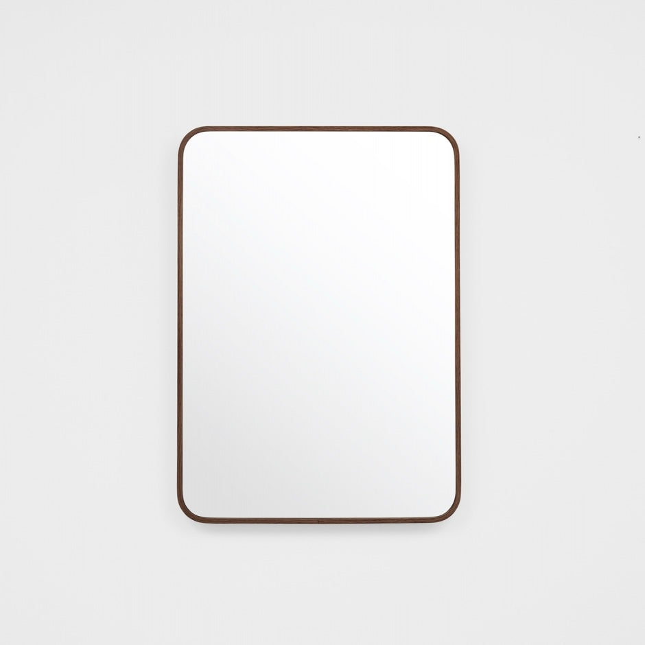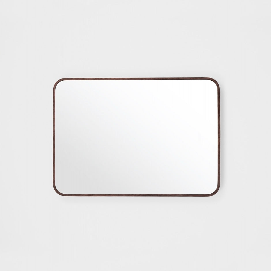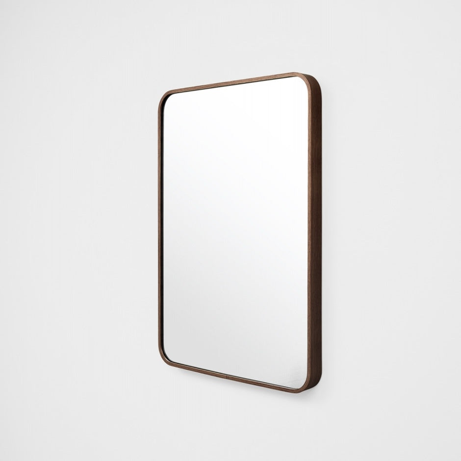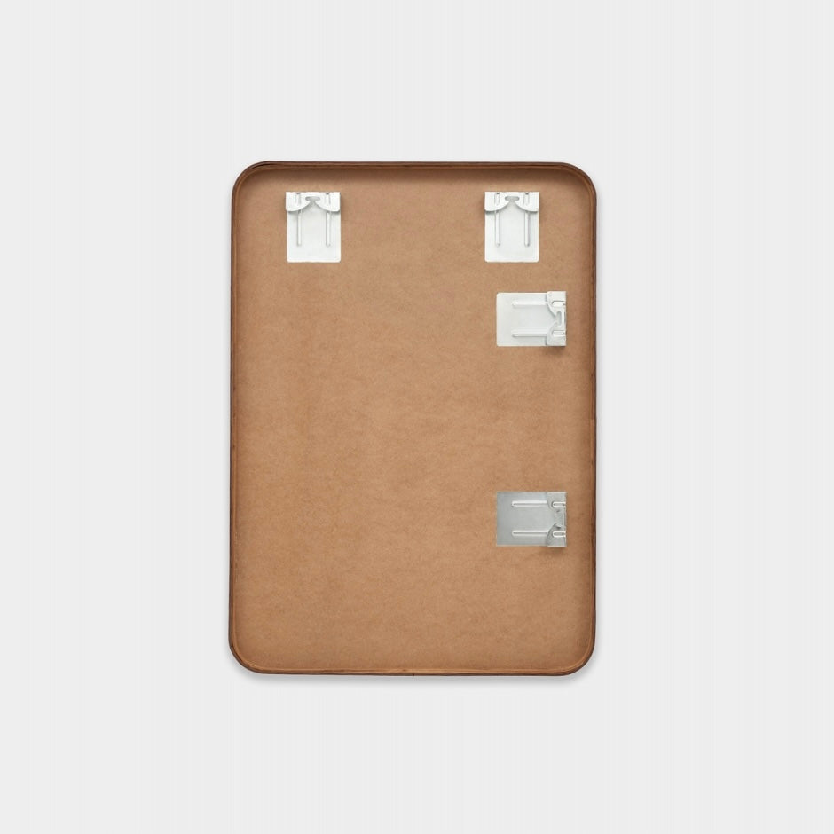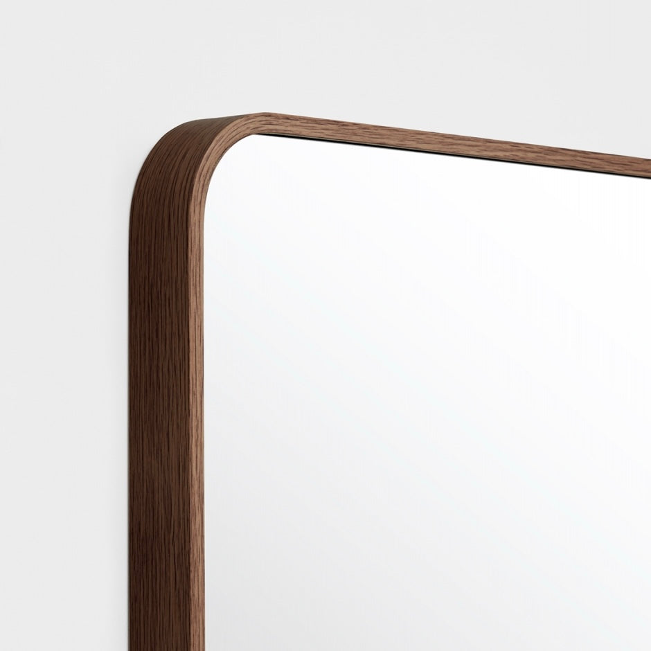 This piece features a slim metal frame with curved corners, finished with a walnut-look synthetic wrap with a simple join at the base of the mirror. This elegant timber-inspired colourway is endlessly versatile, complimenting both bright and neutral colour schemes.