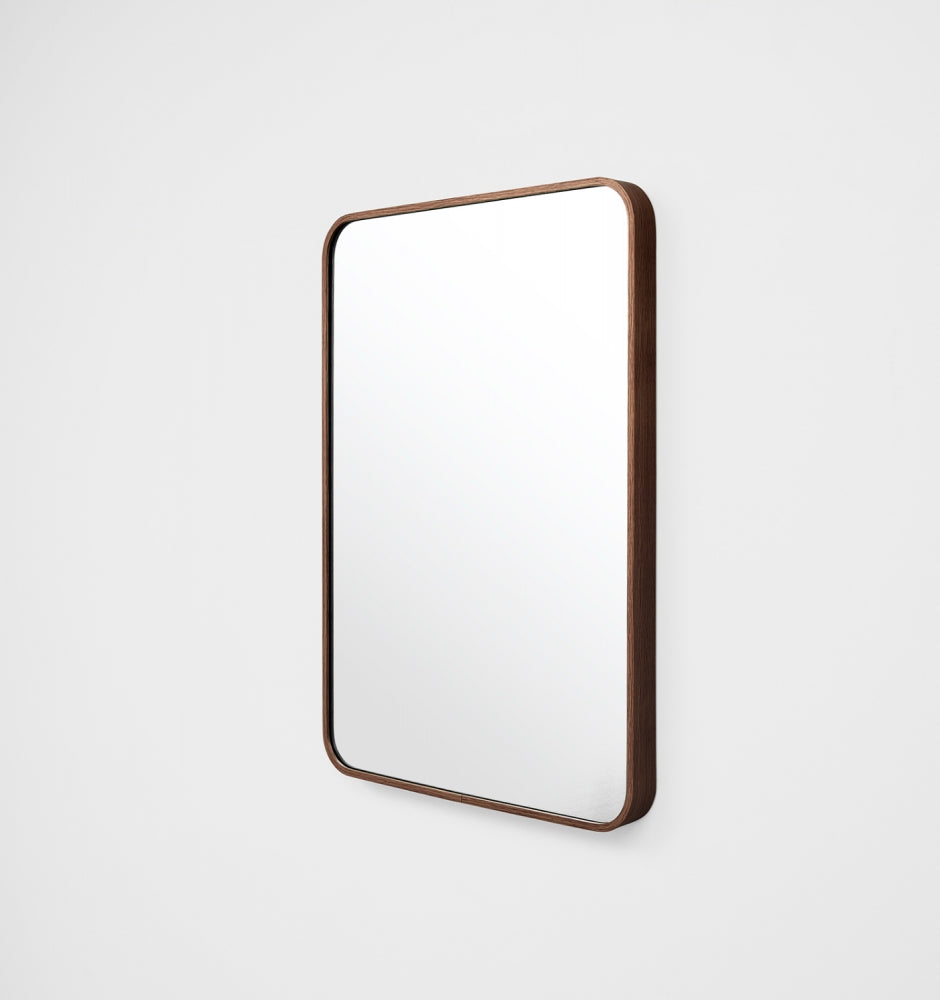 Details and materials: Mirrored glass, aluminium frame with timber-look synthetic wrap, engineered wood backing.