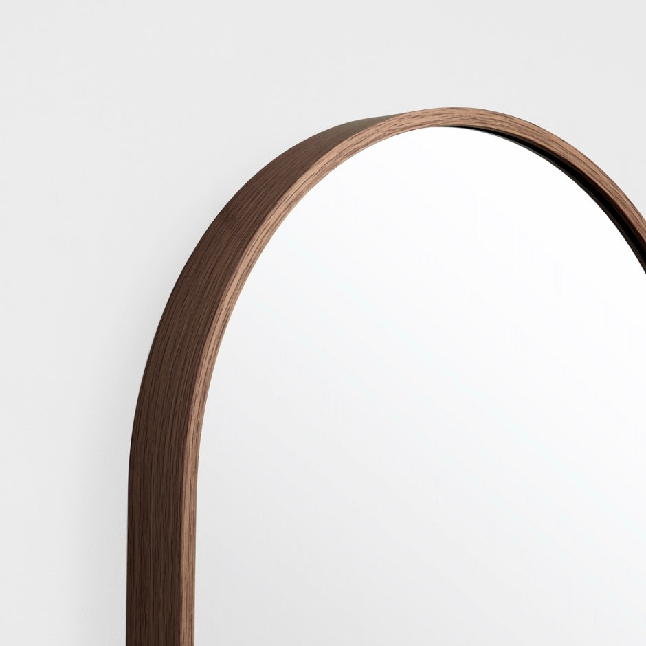 This piece features a slim metal frame, finished with a walnut-look synthetic wrap with a simple join at the base of the mirror. This elegant timber-inspired colourway is endlessly versatile, complimenting both bright and neutral colour schemes.