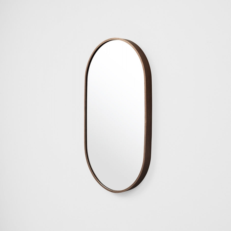Details and materials: Mirrored glass, aluminium frame with timber-look synthetic wrap, engineered wood backing.
