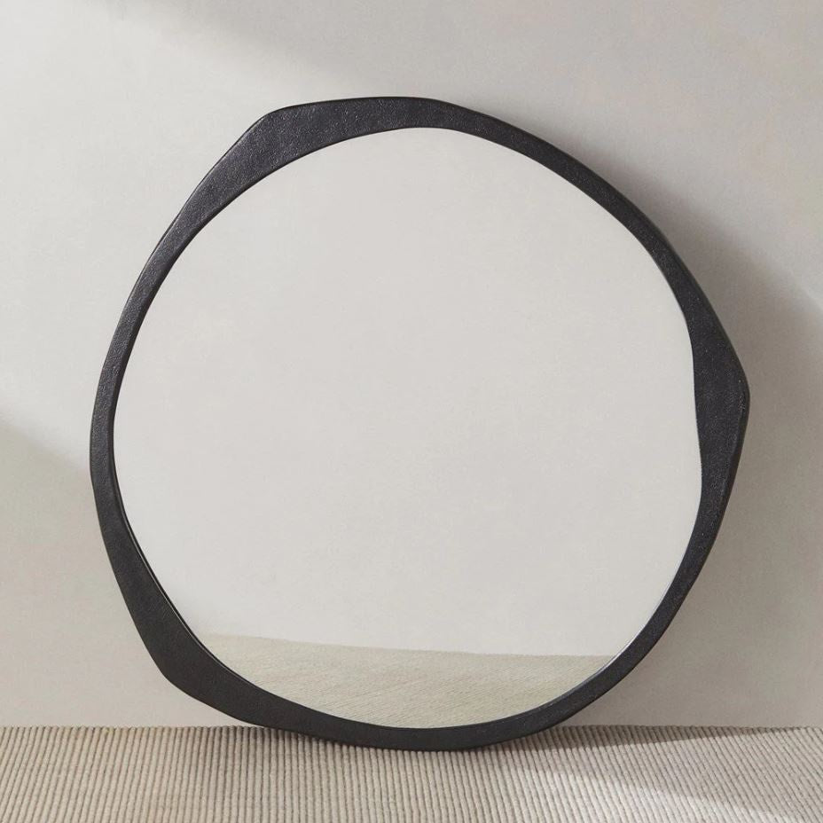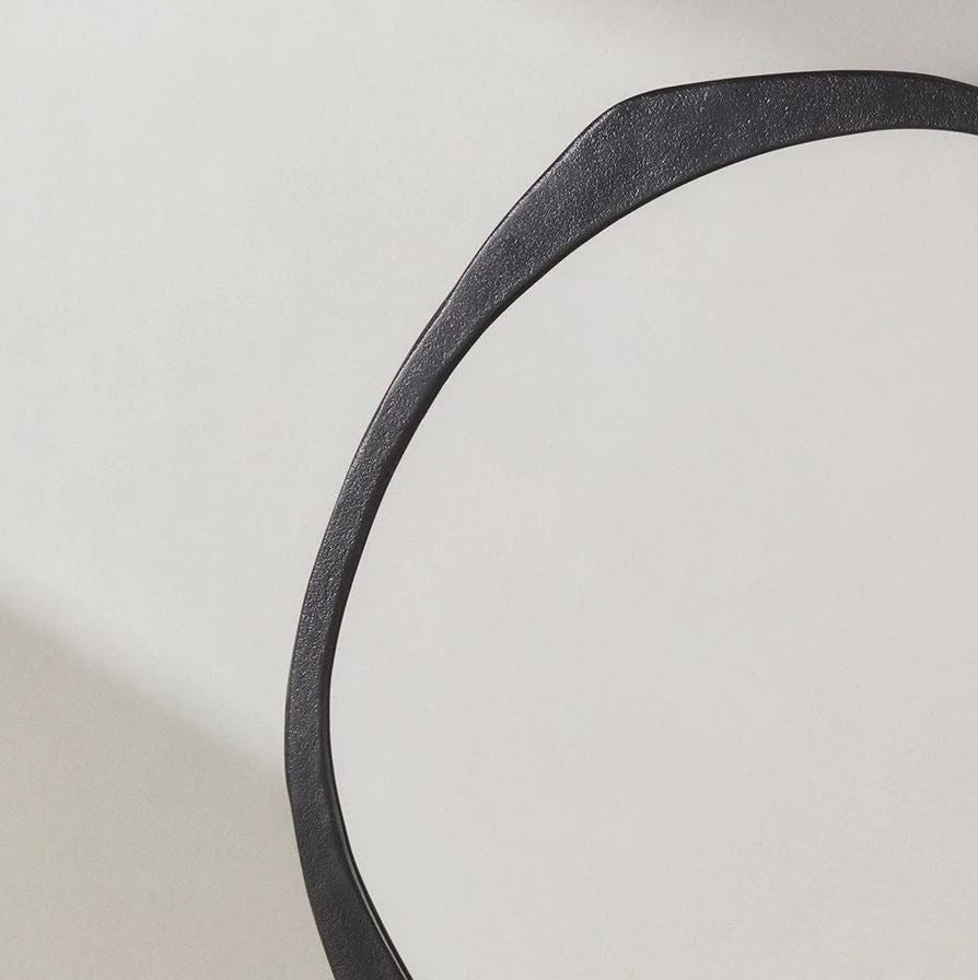 Introducing the Ranch Mirror: a uniquely designed wall mirror with a modern and stylish appeal. This abstract mirror stands out from all others due to its curved organic black metal frame and round shape. Style alongside framed art and photographs or simply display the mirror on its own.