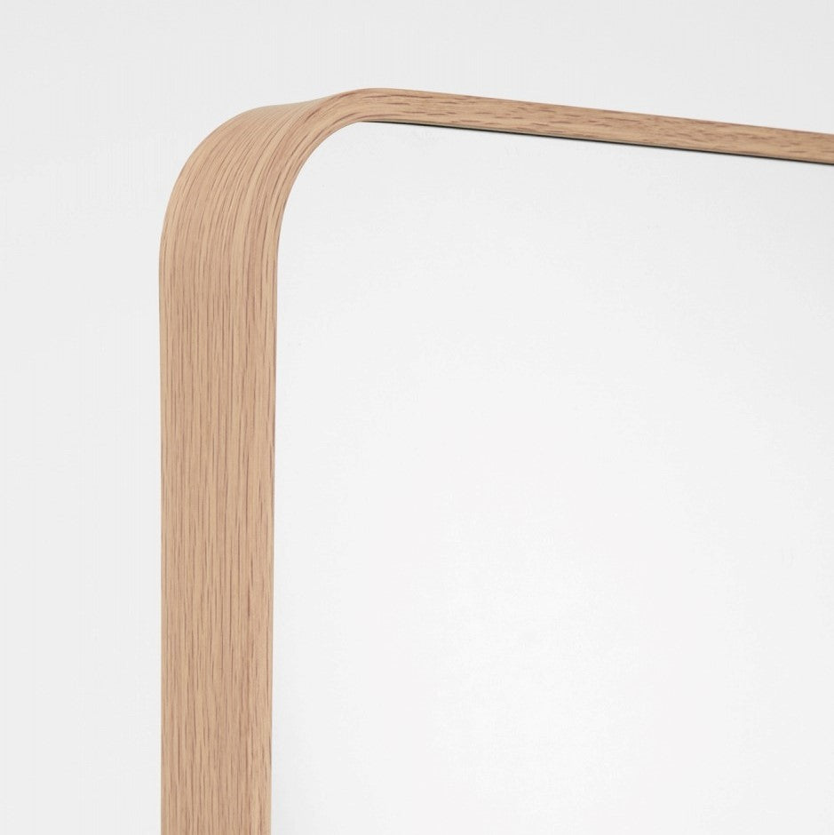 This piece features a slim metal frame with curved corners, finished with a light oak-look synthetic wrap with a simple join at the base of the mirror. This modern timber-inspired colourway is endlessly versatile, complimenting both bright and neutral colour schemes.