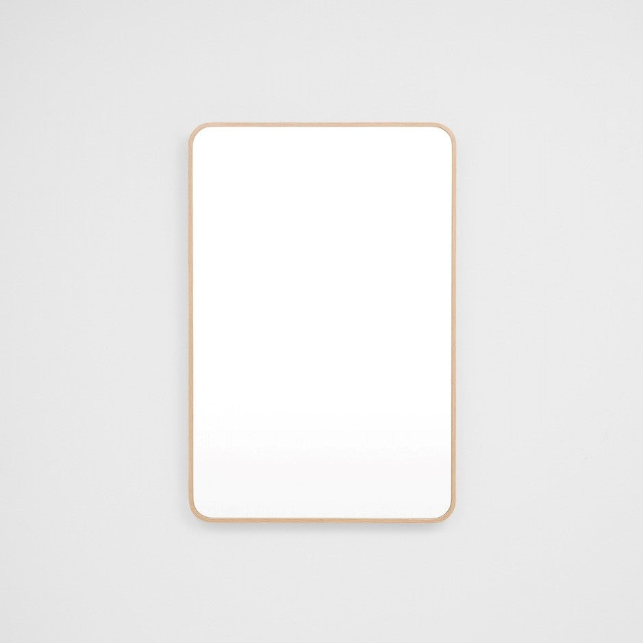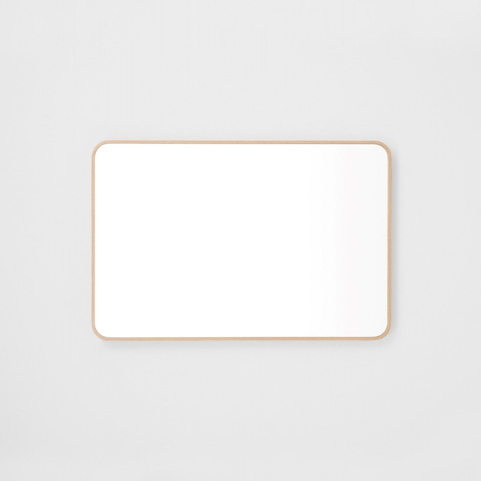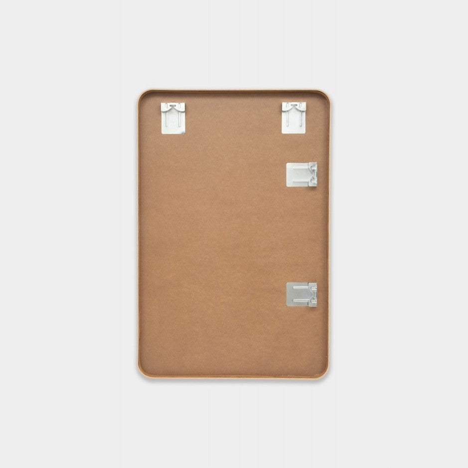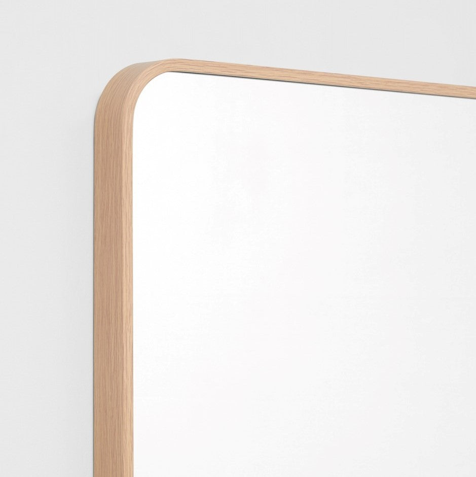 This piece features a slim metal frame with curved corners, finished with a light oak-look synthetic wrap with a simple join at the base of the mirror. This modern timber-inspired colourway is endlessly versatile, complimenting both bright and neutral colour schemes.