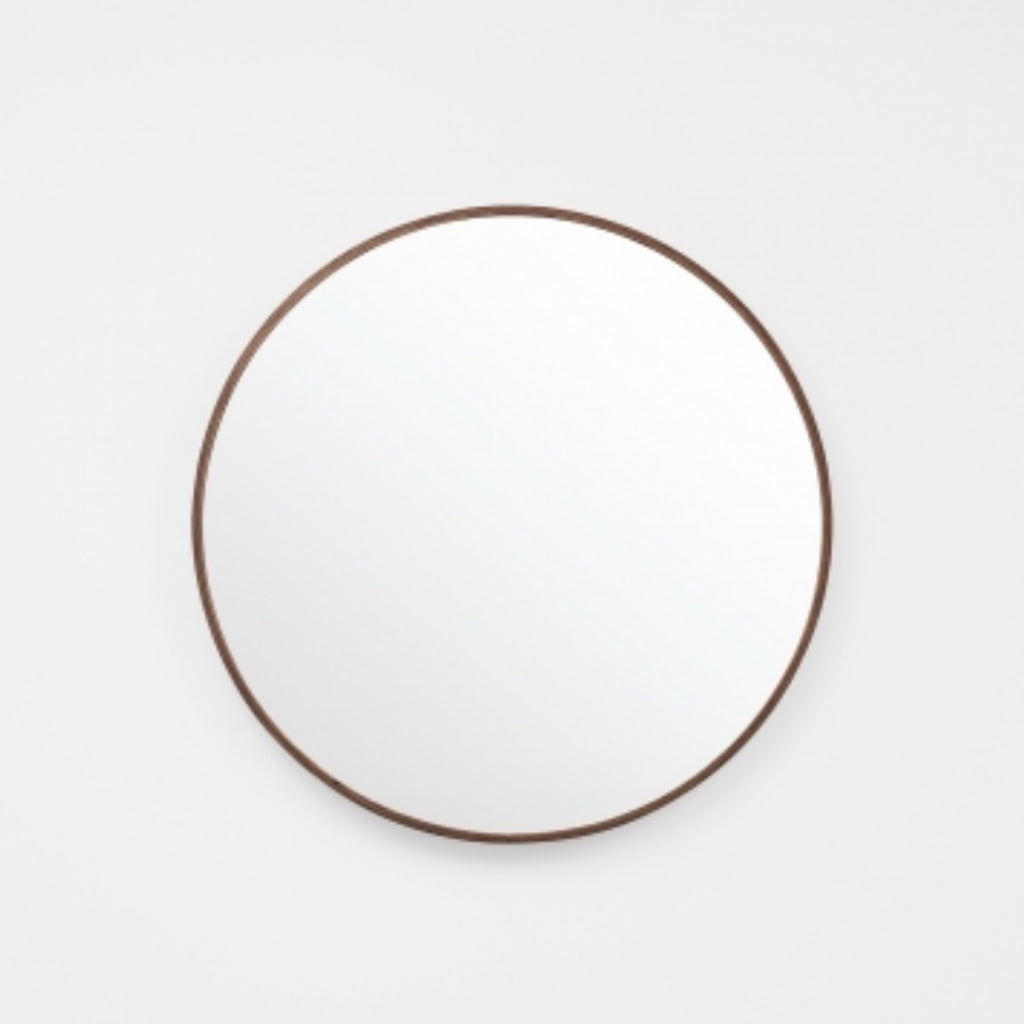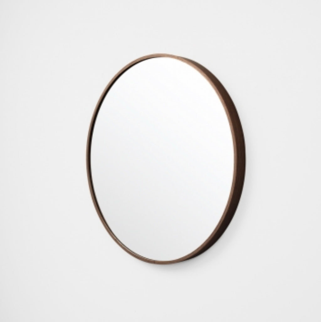 This piece features a slim metal frame, finished with a walnut-look synthetic wrap with a simple join at the base of the mirror. This elegant timber-inspired colourway is endlessly versatile, complimenting both bright and neutral colour schemes.