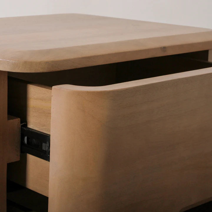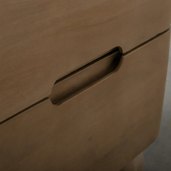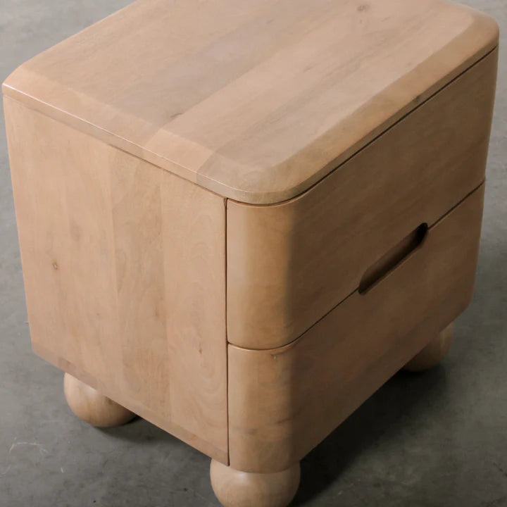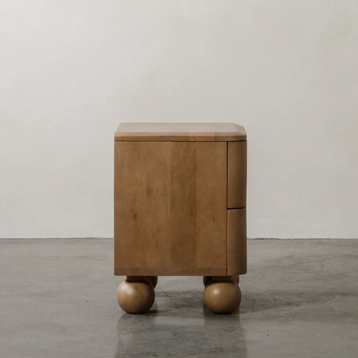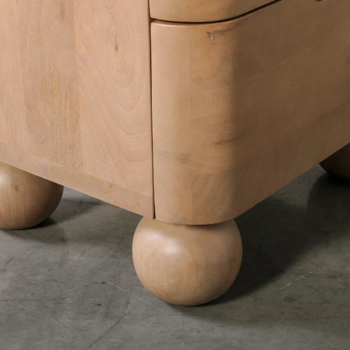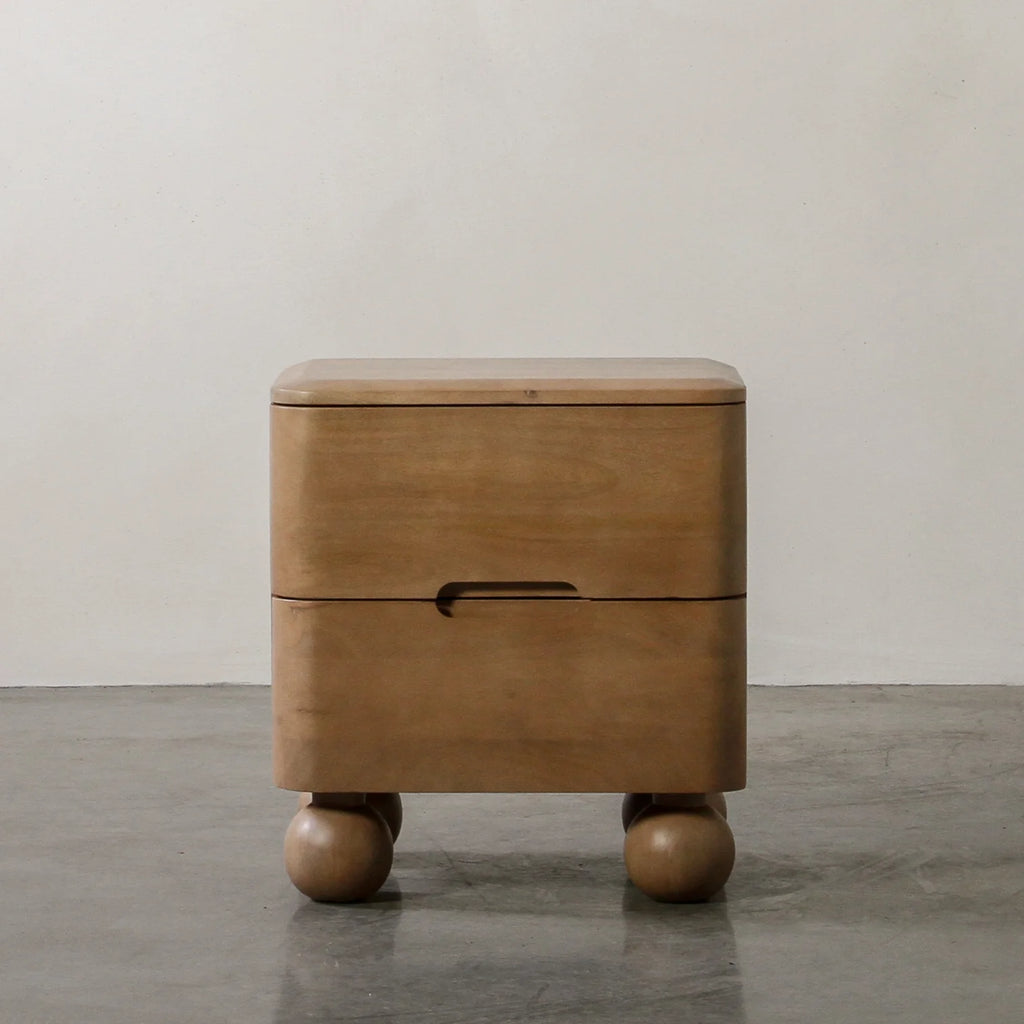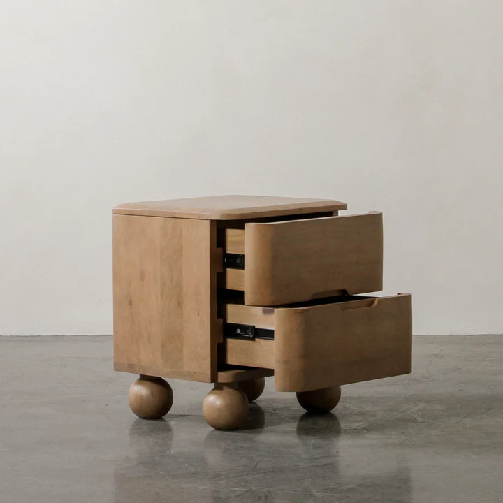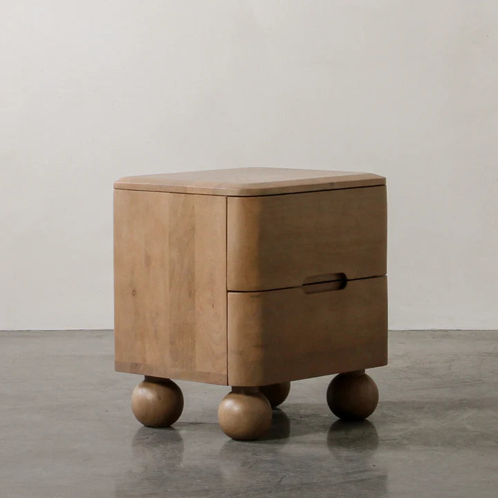 The Totem Bedside Table is a beautiful blend of form and function, perfect for adding warmth to your bedroom. It showcases a rich grain that adds visual depth, while the round, sphere-shaped legs give it a unique sculptural quality. You can choose from the warm light brown or a more subtle white wash, allowing you to choose the perfect style to complement your bedroom. With two spacious drawers, this bedside table offers ample storage for nighttime essentials, from books to electronics. Its natural finish complements a variety of styles, whether your decor leans toward modern, rustic, or coastal. To style, add a small ceramic lamp or a cluster of decorative objects on top, letting the organic textures and tones shine.