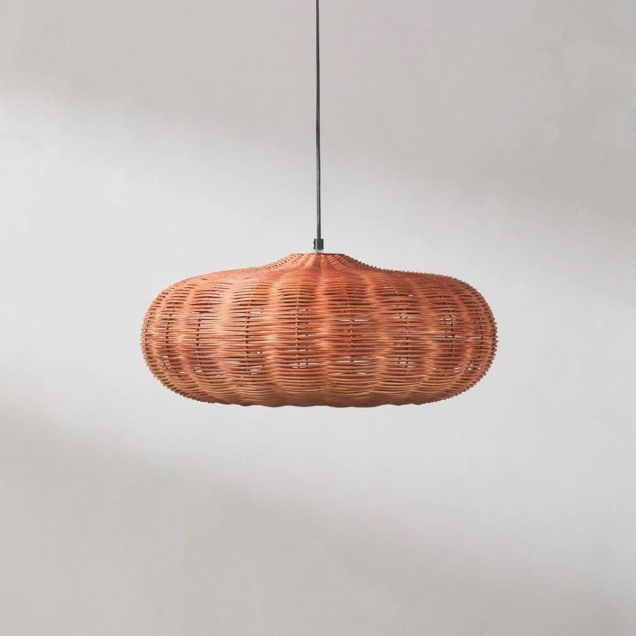 Handcrafted in India from natural rattan, the Droplet Rattan Pendant light brings warmth and a casual aesthetic to any interior. The natural fibres of the rattan are expertly woven together to create a sturdy and durable shade that diffuses light softly and evenly, creating a warm and inviting atmosphere. The droplet shape of the lamp shade, with round soft edges, is reminiscent of mid-century curvaceous designs. Designed as a statement lighting feature, this pendant light hangs perfectly above a dining table or grouped in a pair or set of three over a kitchen island bench.