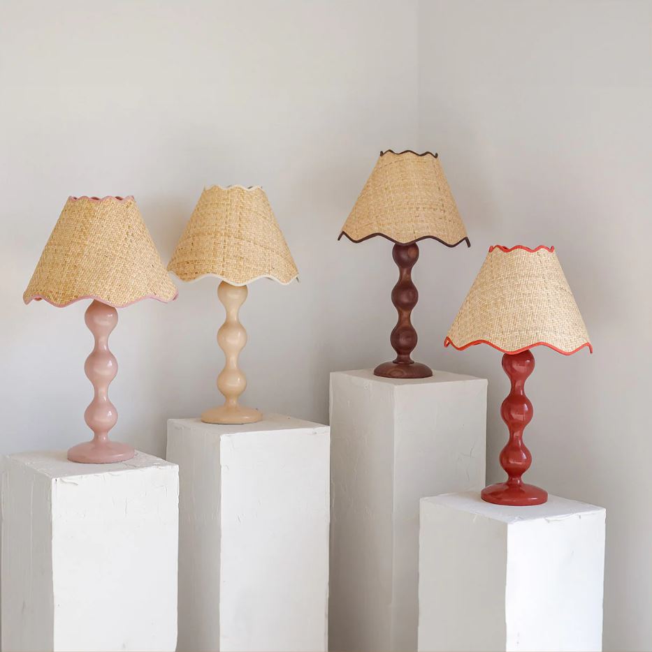 The Evie Table Lamp: A marvel of design and artistry awaits. Crafted with natural raffia, its handcrafted lampshade features exquisite scalloped edges that add a delicate touch to its unique spherical shape.