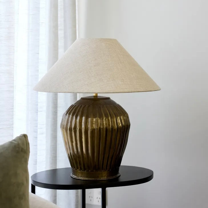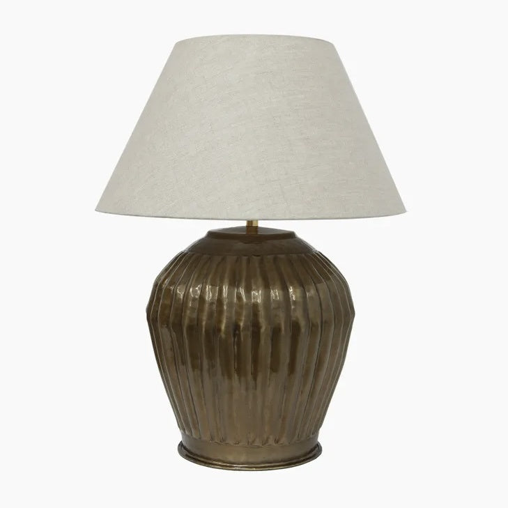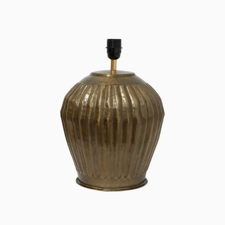 With a ribbed design and an aged brass finish, the Kerali Ribbed Lampbase features soft, curved shapes in both small and large sizes. The antique brass metallic accents bring a subtle, sophisticated touch to any lighting arrangement. Available in two sizes.