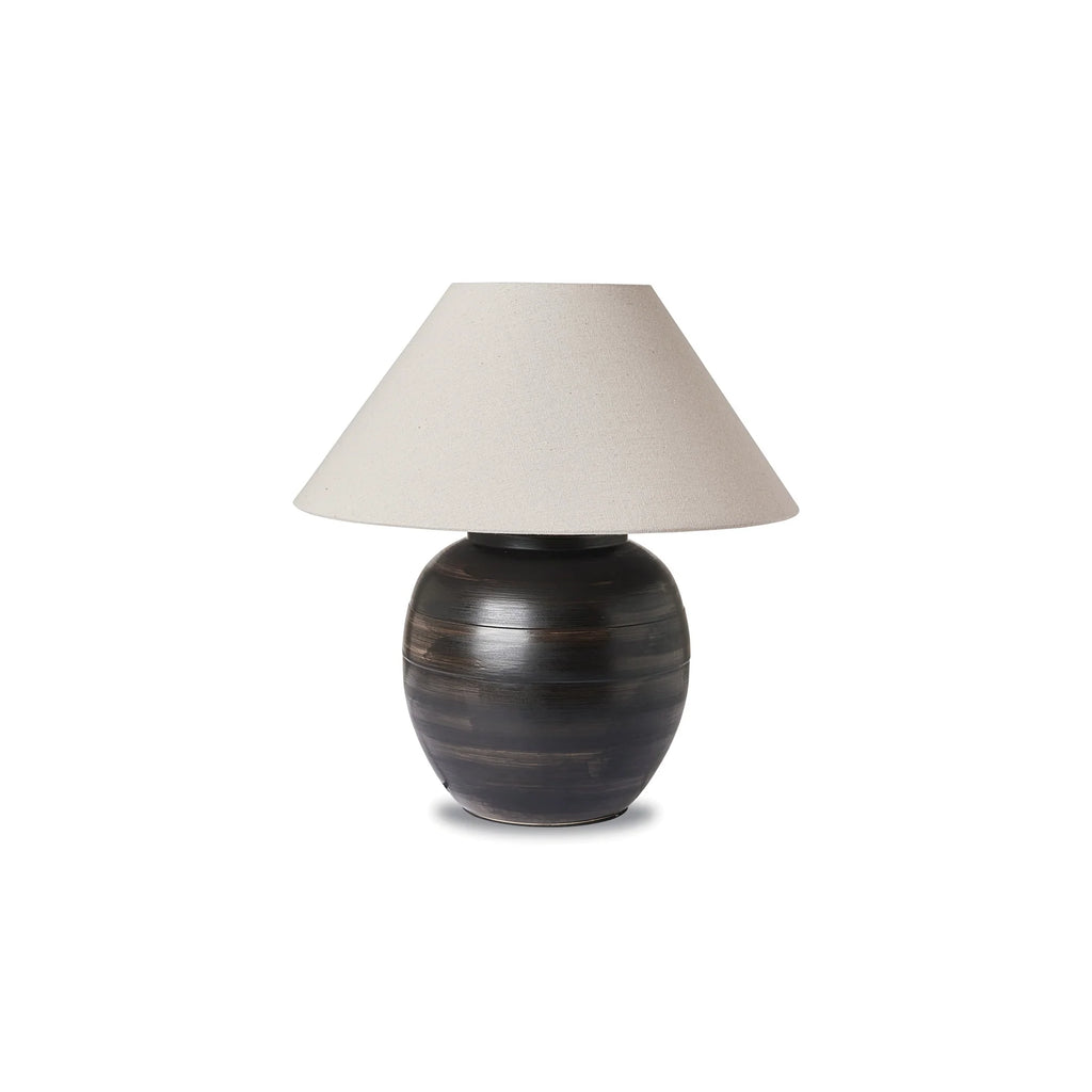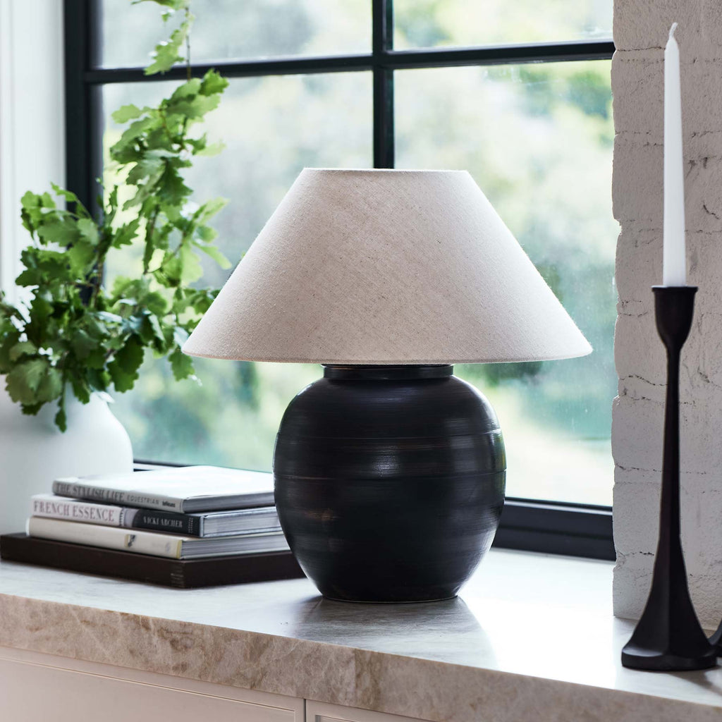 The Nigella Black Ceramic Table Lamp boasts a spherical base crafted from black ceramic with brass-toned details for a distinctive aesthetic. Topped with a beautifully tapered linen shade, the Nigella lamp emanates a warm, inviting glow. Its unique design adds a touch of elegance and sophistication, making it a perfect fit for any decor style.