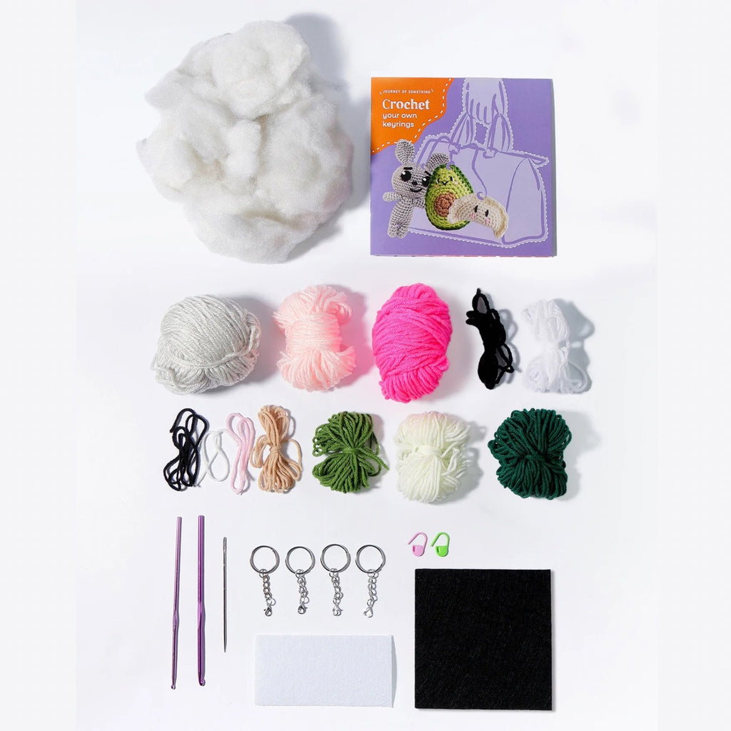 Create cuteness for your bag, keys, coin purse or anywhere you can hang something. This crochet kit includes everything you need and step by step instructions for a dumpling, avocado, teddy-bear and galah.