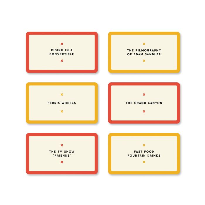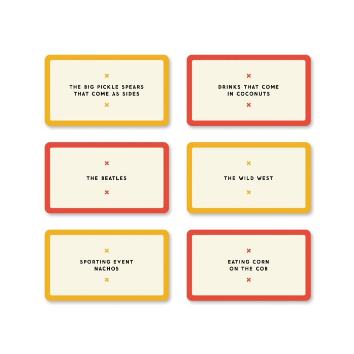 Includes 200 double-sided cards with 400 prompts like ‘The Beatles,‘ ‘Drinks that come in a Coconut,’ and ‘Avocado Toast.