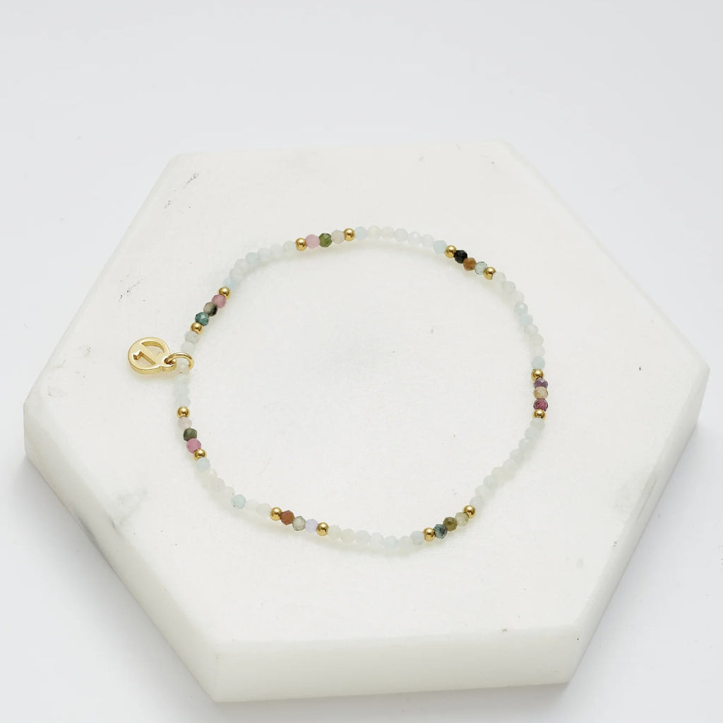 This fine bracelet showcases semi-precious stone beads in captivating blush colours, adding a touch of sophistication to your wrist. Crafted with meticulous attention to detail, the Alenka Bracelet exudes a timeless charm that effortlessly elevates any ensemble. Its lightweight design and comfortable fit make it perfect for everyday wear or special occasions.