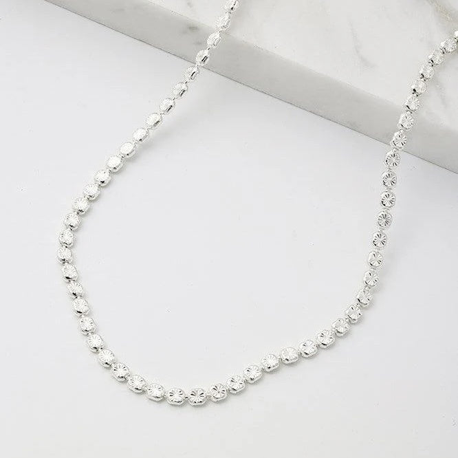A versatile and stunning accessory that adds a touch of elegance to your neckline. This necklace features a disk pendant with delicate engravings, creating a beautiful and intricate design. Its disk detail adds a modern and stylish element to the piece, while the necklace's length makes it the perfect layering companion. Whether worn alone for a minimalistic look or layered with other necklaces for a fashionable statement, the Belle Necklace effortlessly enhances your style.