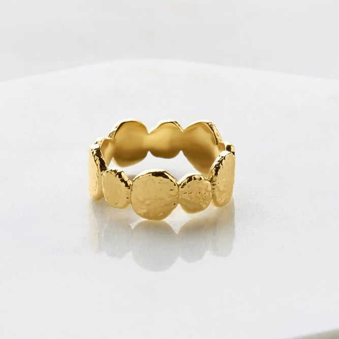 Introducing the Chloe Ring, a stunning handcrafted piece from our Artisan Range. Featuring a unique hammered texture and luxurious 18k gold with 2-micron plating, this ring is a true testament to refined craftsmanship and timeless elegance. Whether worn solo or stacked, the Chloe Ring adds distinctive sophistication and artistry to any look, making it the perfect statement piece.