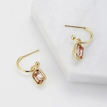 A delicate and stylish accessory that combines a hoop design with a rectangular peach-coloured crystal drop. These earrings exude a sense of modern elegance and understated charm. The delicate hoop adds a touch of sophistication, while the rectangular crystal drop in peach colour brings visual interest.