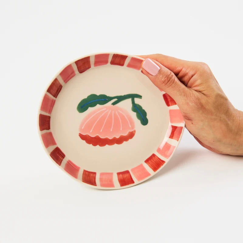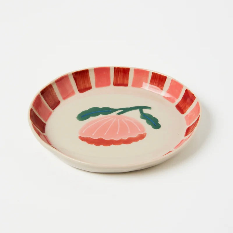 Delicate and versatile, the Pink Flower Dish is a sweet little spot for trinkets, teaspoons or treats. Featuring a hand-painted bloom and striped red border, this earthenware piece brings colour and charm to any surface.