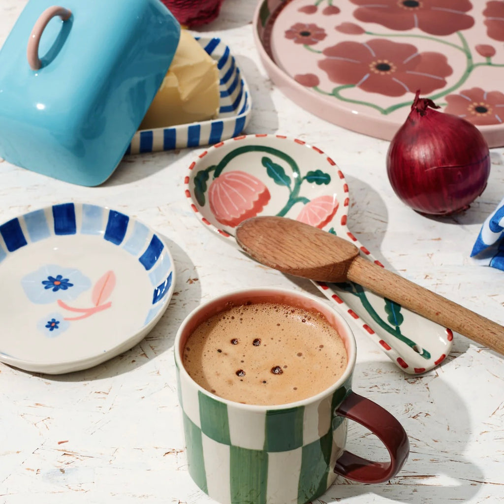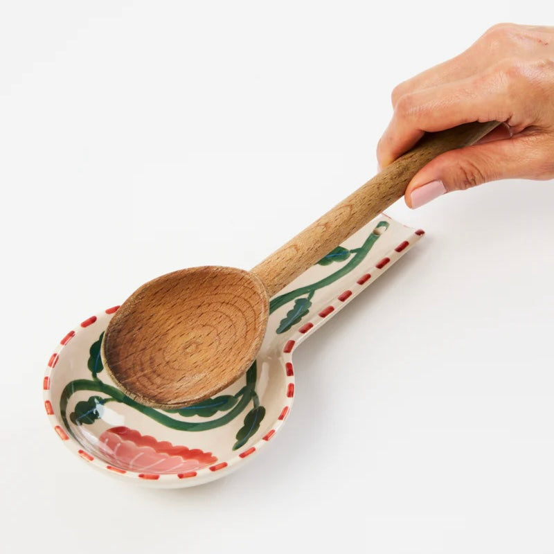 'Rest easy. This ceramic spoon rest features a bold floral design in painterly pinks and greens, bordered by a checked red trim. Its handmade from earthenware and just the thing for catching drips and splattered spoons while adding a little joy to your stovetop or counter.