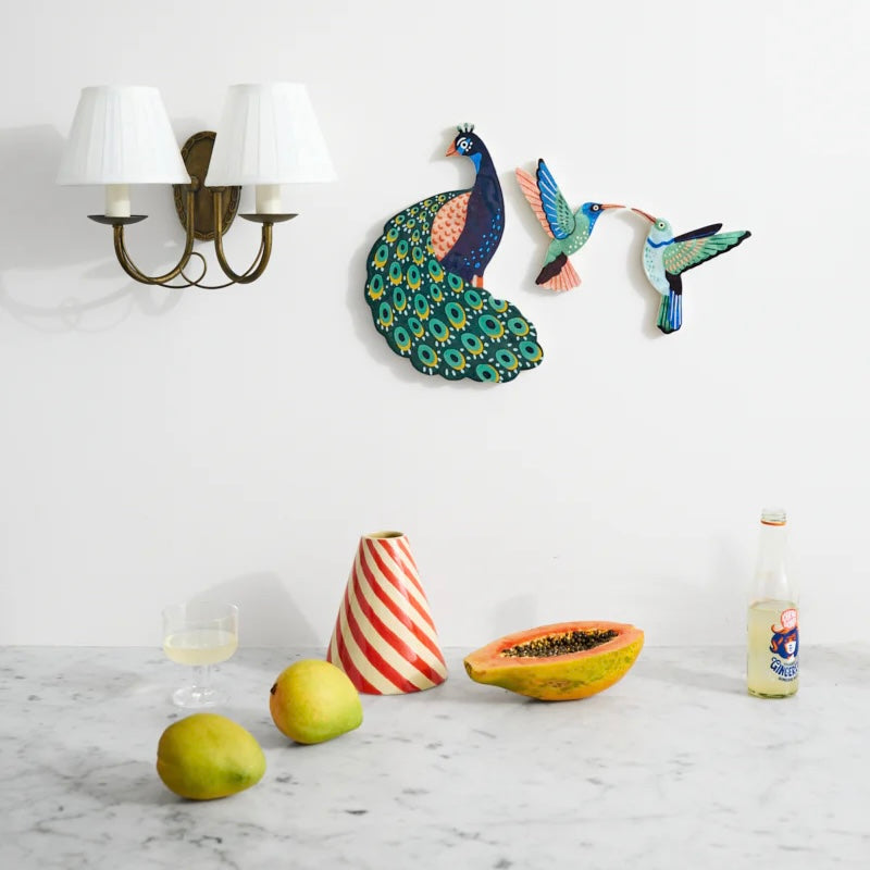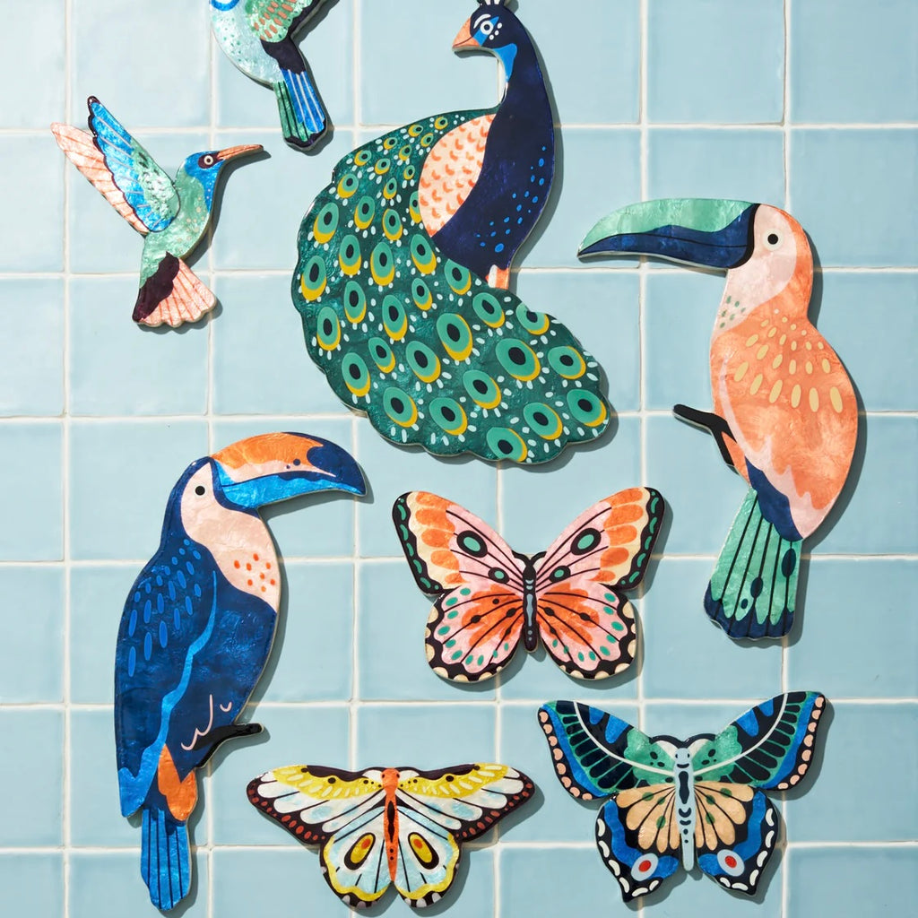 Proud as a peacock and twice as charming. This handmade peacock wall art is crafted from lustrous capiz shell, then painted by hand in rich jewel tones and bold patterning. It's tropical bird decor with a personality as colourful as its tail feathers. Team with other winged art in the Canopy range for ultimate tropical joy!