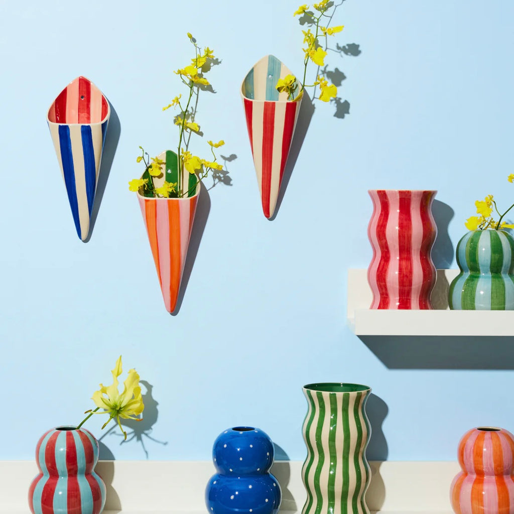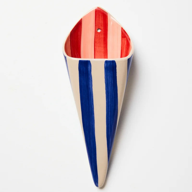 Coastal and crisp, the Folly Blue Stripe Wall Vase features hand-painted navy and cream stripes with a contrasting red and pink interior. Hang it on its own or with others for a pop of pattern and sculptural flair, perfect for a small bouquet, a dried stem, or just a moment of pure style.