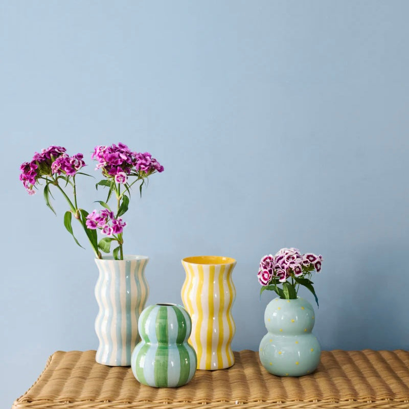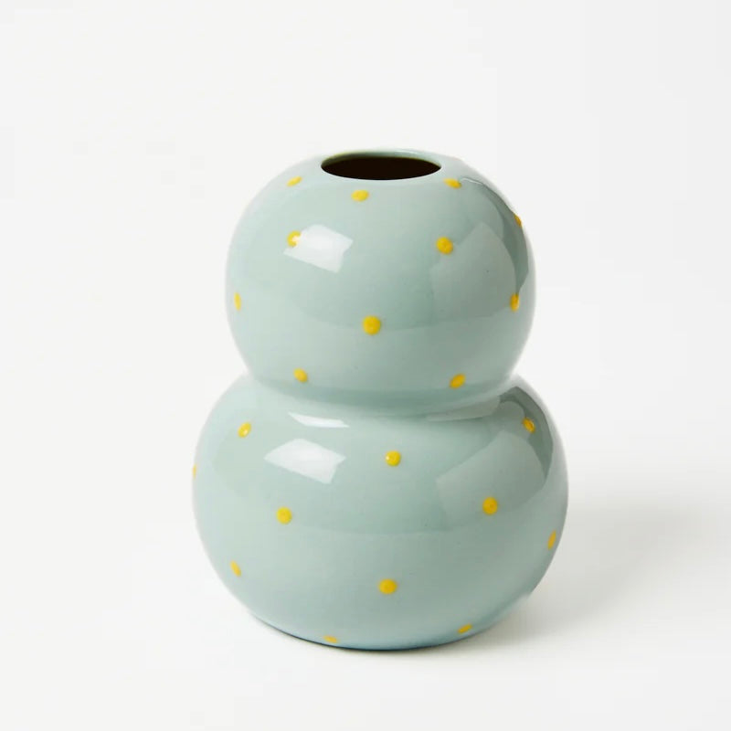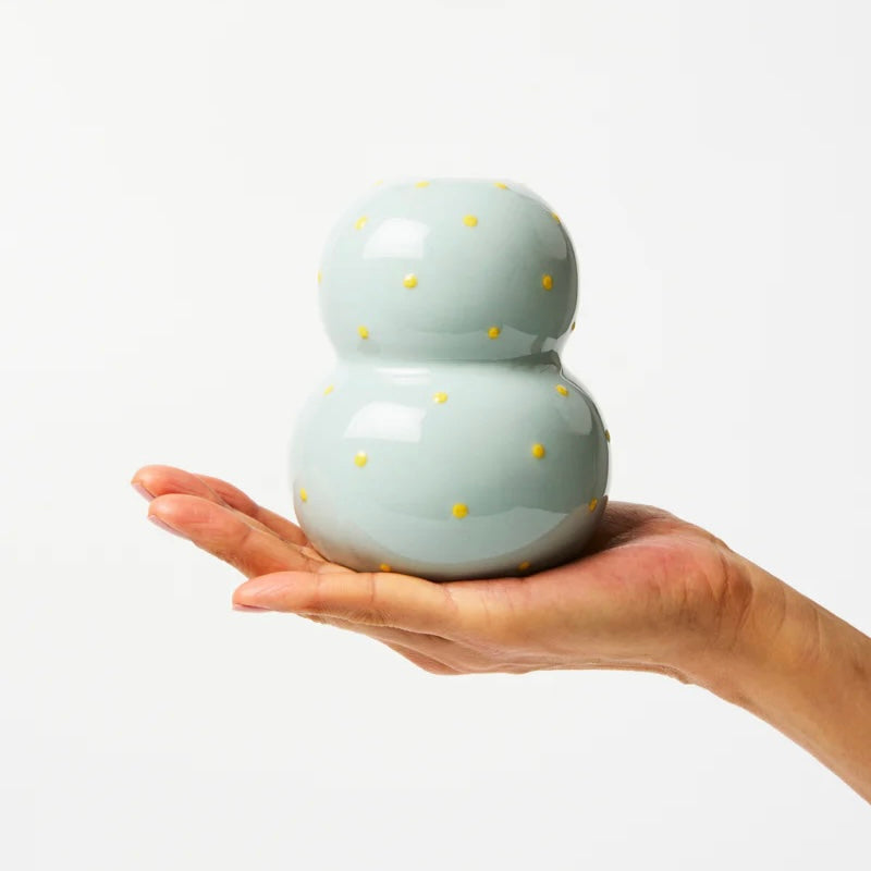 Soft and sweet, this light blue bubble vase is dotted with raised yellow dots - each one hand-applied for a subtle, tactile detail. The perfect blend of calm and cheer. Designed to be mixed and matched with the Palma vases.