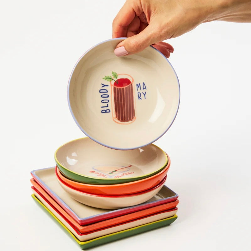 A little bit spicy and full of charm. This Bloody Mary snack bowl features a sky blue rim and tomato-red base - a playful cocktail motif in the centre. Ideal for celery sticks, anchovy olives or anything salty. Also: highly giftable.