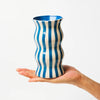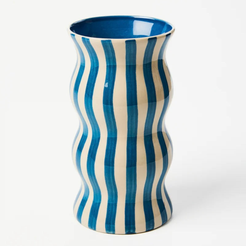 A modern classic. The Palma Navy Stripe Vase combines rich navy and soft white stripes in a tall wavy form that feels timeless but fresh. A grounding piece for florals or stand alone display.