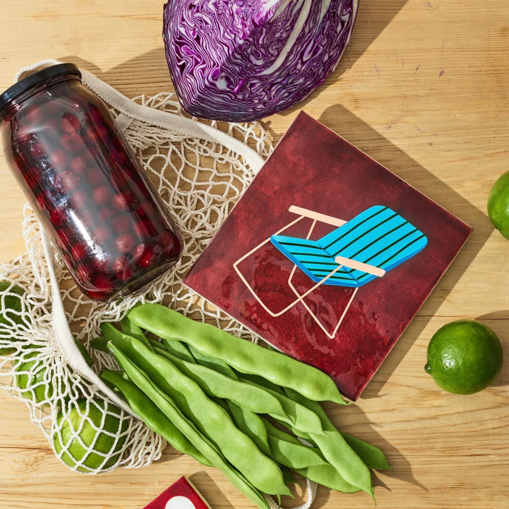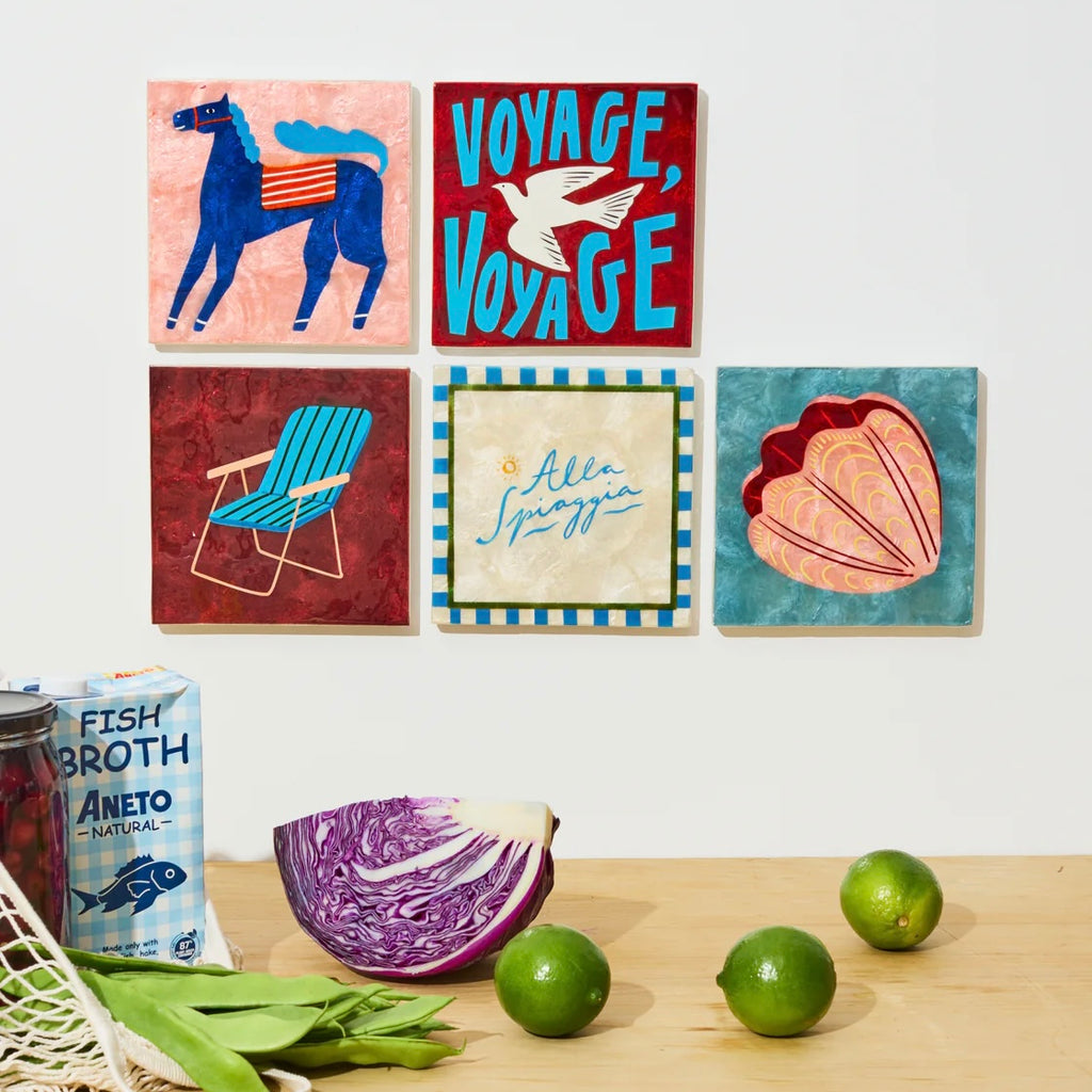 A stripey deck chair and a no rush attitude. This vintage style chair tile is the ultimate nod to laid-back coastal living. Crafted on shimmering capiz shell in deep cherry tones, it's ready to lounge wherever you hang it.