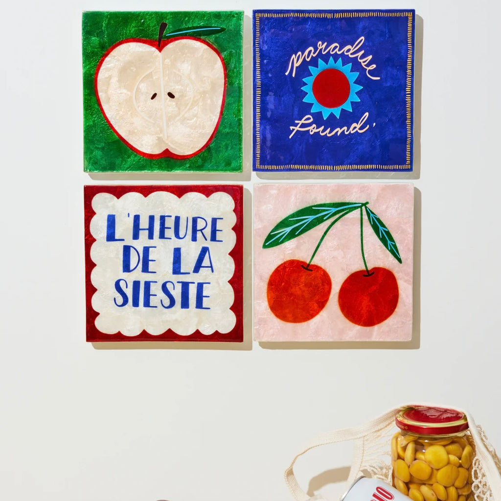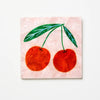 Sweet and shiny. This hand painted cherries tile is a love letter to fun, colour, and a little bit of mischief. Painted on luminous capiz shell with rich red and deep green tones We love this combined with one of the text phrases in this series.