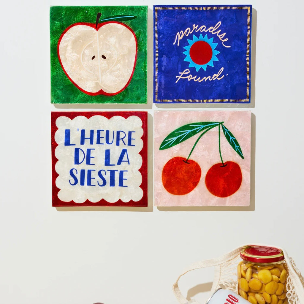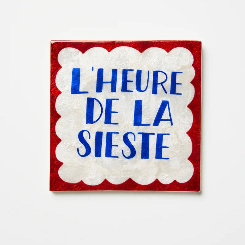 L'heure de la sieste. This dreamy tile is hand-lettered on soft cream capiz with royal blue accents and a scallop border. And makes no qualms about it, it's nap time. A perfect piece for the bedroom, sunroom or anyone who champions rest. We love this in a kids room with some of the other graphic Superette wall tiles.