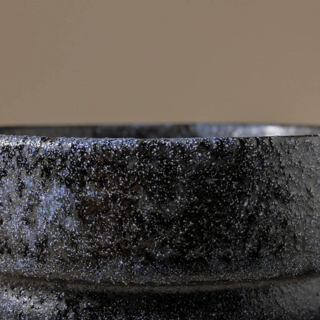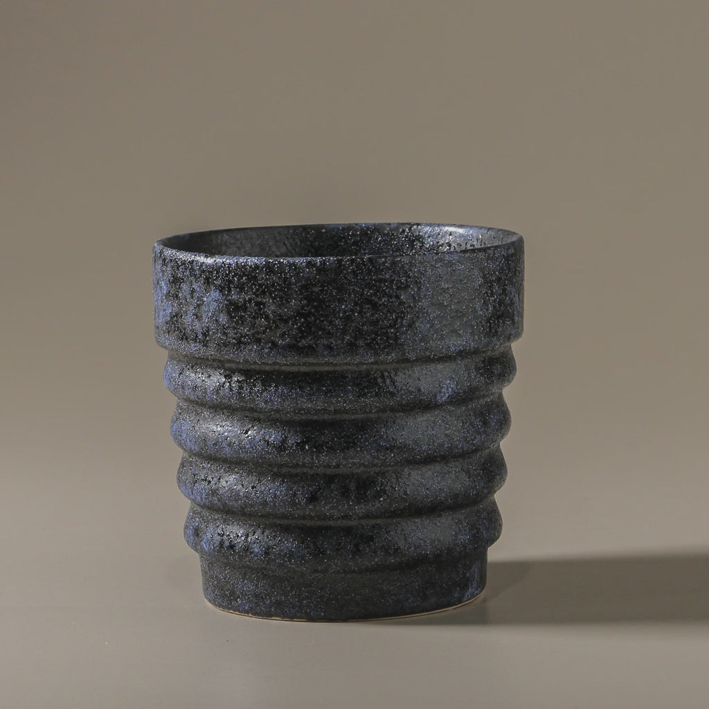 The Cobalt Pot is a refined addition to any interior, featuring a rich teal and indigo glaze. Available in two sizes, it is crafted from ceramic with a textured, reeded surface that brings a layered, tactile quality to its design. The linear shape enhances its visual contrast, offering a dynamic play of light and texture. The interplay of deep blue and charcoal tones grounds its surroundings while maintaining an organic aesthetic.