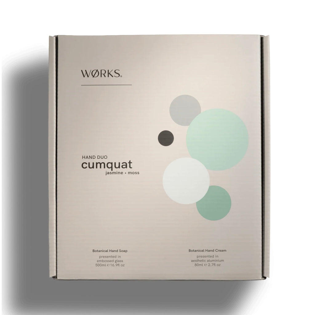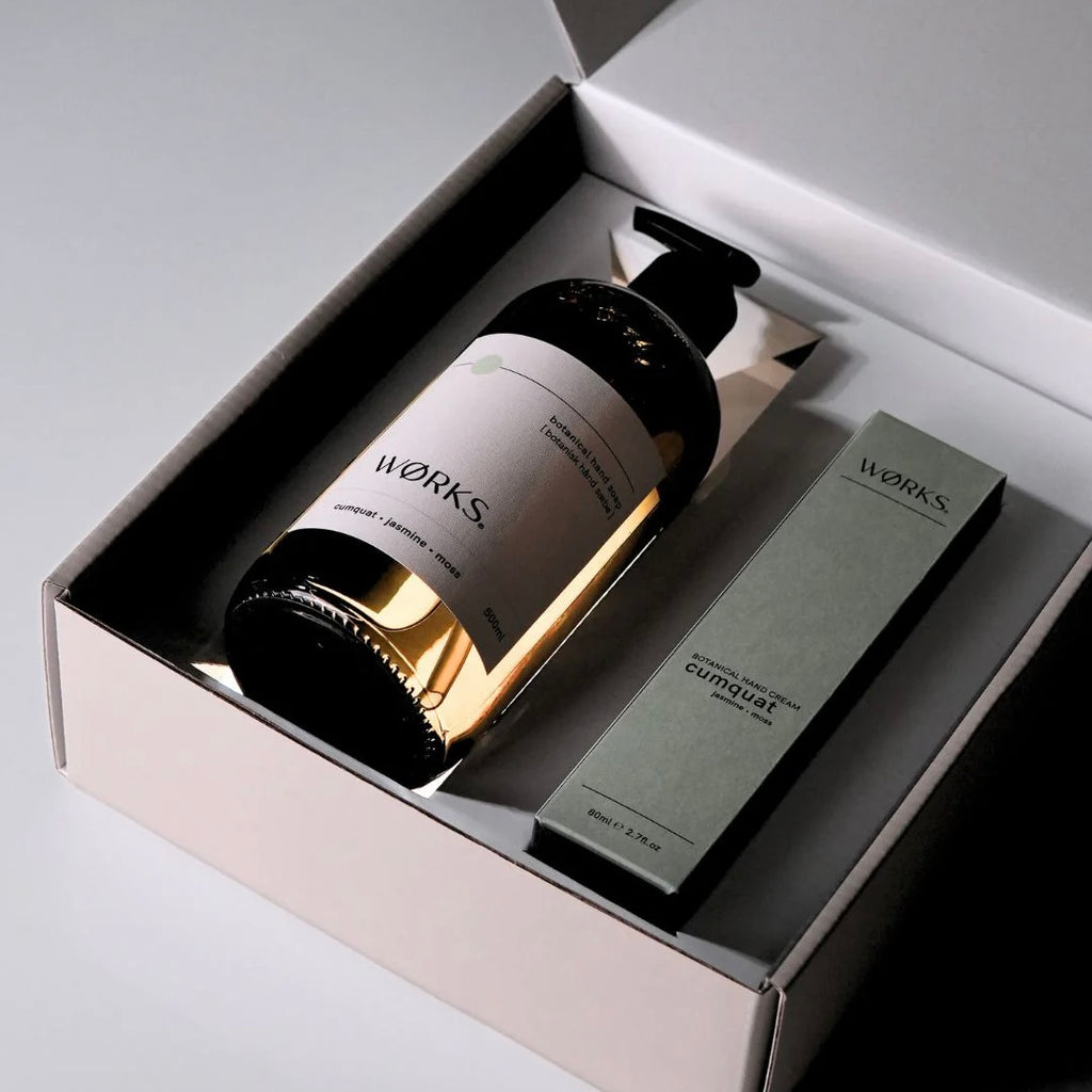 Lift the lid to reveal a Cumquat Hand Soap 500ml perfectly presented alongside its complementary Cream 80ml.