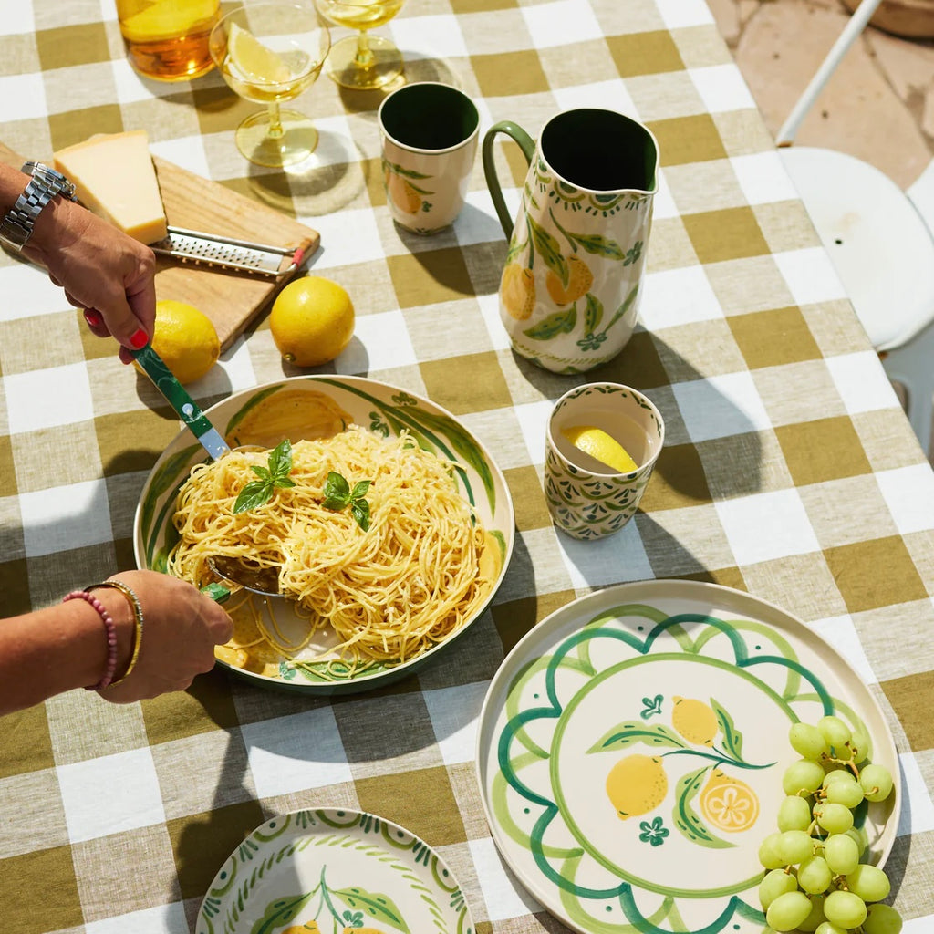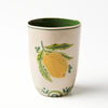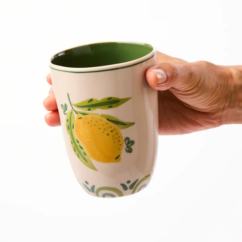 A single golden lemon, rendered with careful brushstrokes, adorns this hand-painted cup where form follows feeling. The verdant interior creates a moment of discovery with each sip, while its generous proportions make it equally suited to morning coffee or evening digestifs. An everyday companion to elevate simple moments, lovely used in partnership with the Tavola Jug.