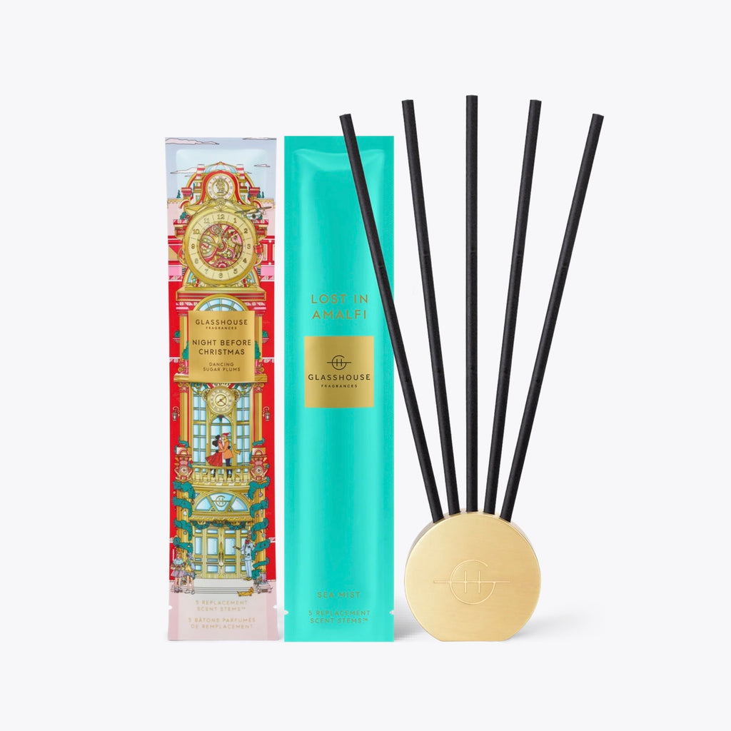 The Scent Scene™ Duo includes two individually packaged Scent Stems™ fragrances: Night Before Christmas Dancing Sugar Plums (limited edition) and Lost In Amalfi To use place your Scent Stems™ of choice into the metal vessel, ensuring it's placed on a flat surface away from open windows or vents. After 30 days, or a time of your choosing, swap out the Scent Stems™ for the other supplied fragrance.