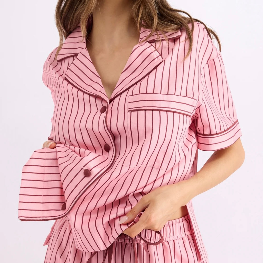Complete outfits and elevate nightly routines with our short sleeve shirt. Crafted with comfort in mind, this classic silhouette features playful piping details, lapel collar and self-covered buttons for both slumber and style. Exceptionally soft and breathable, our short sleeve shirt is durable and silky to the touch. Designed to be mixed and matched, combine printed stripes and solid colourways to suit your personal style—or pair it with other wardrobe staples for easy, everyday dressing.
