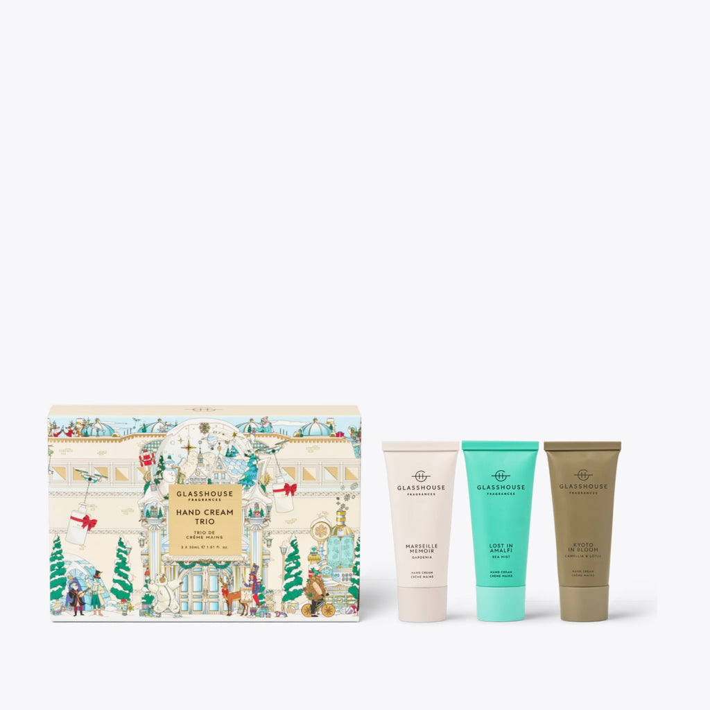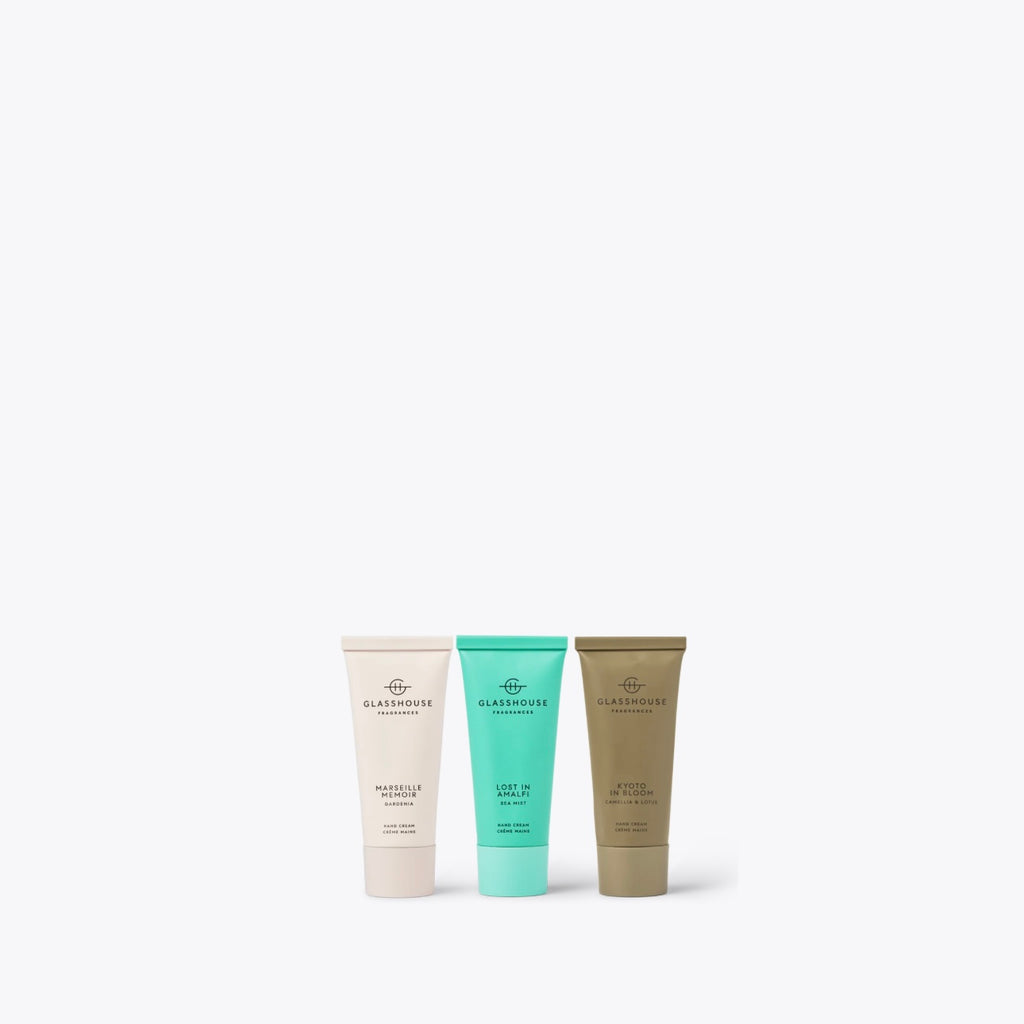 Contains 1 x Kyoto In Bloom 30mL Hand Cream, 1 x Lost In Amalfi 30mL Hand Cream, 1 x Marseille Memoir 30mL Hand Cream all wrapped in Gift Box with designs by Aeoniumsky.