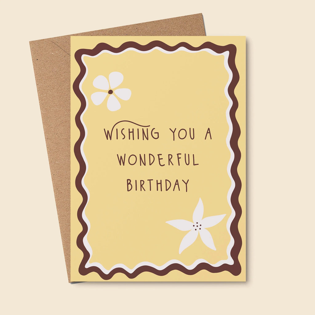 Wishing You a Wonderful Birthday – Minimalist Floral Greeting Card Celebrate in style with this beautifully designed birthday card, featuring a warm pastel yellow and brown background, charming hand-drawn florals, and a playful wavy border for a modern, trendy touch. The simple yet heartfelt message makes it perfect for sending love and good vibes on someone’s special day.