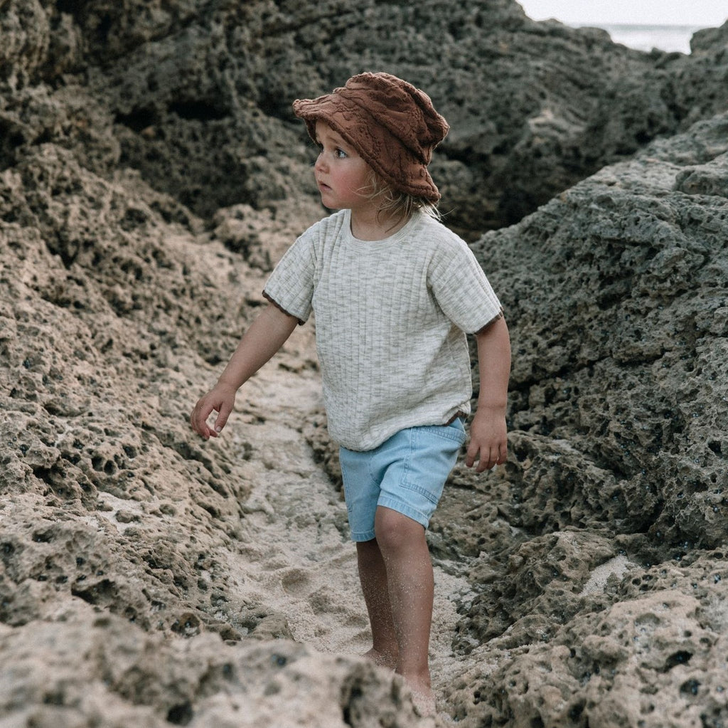 Knitted tee made with a 100% Organic Cotton with GOTS certification. This tee has a chunky rib all over and self finishing edges at the hem and cuffs with a contrast colour stripe. This tee also features a dropped shoulder. This tee is knitted with a space dyed yarn in a latte colour way.