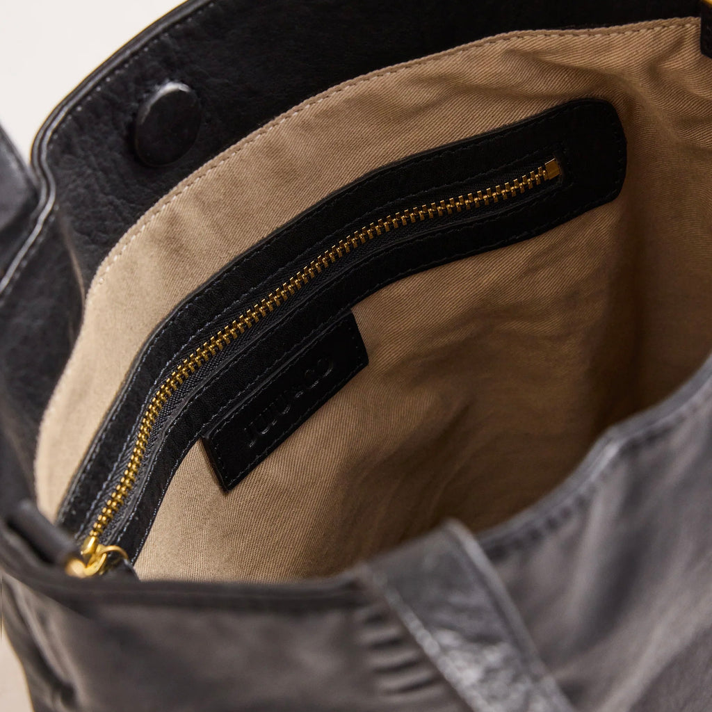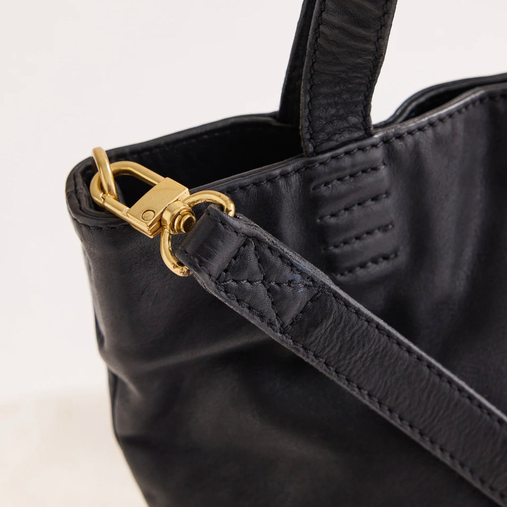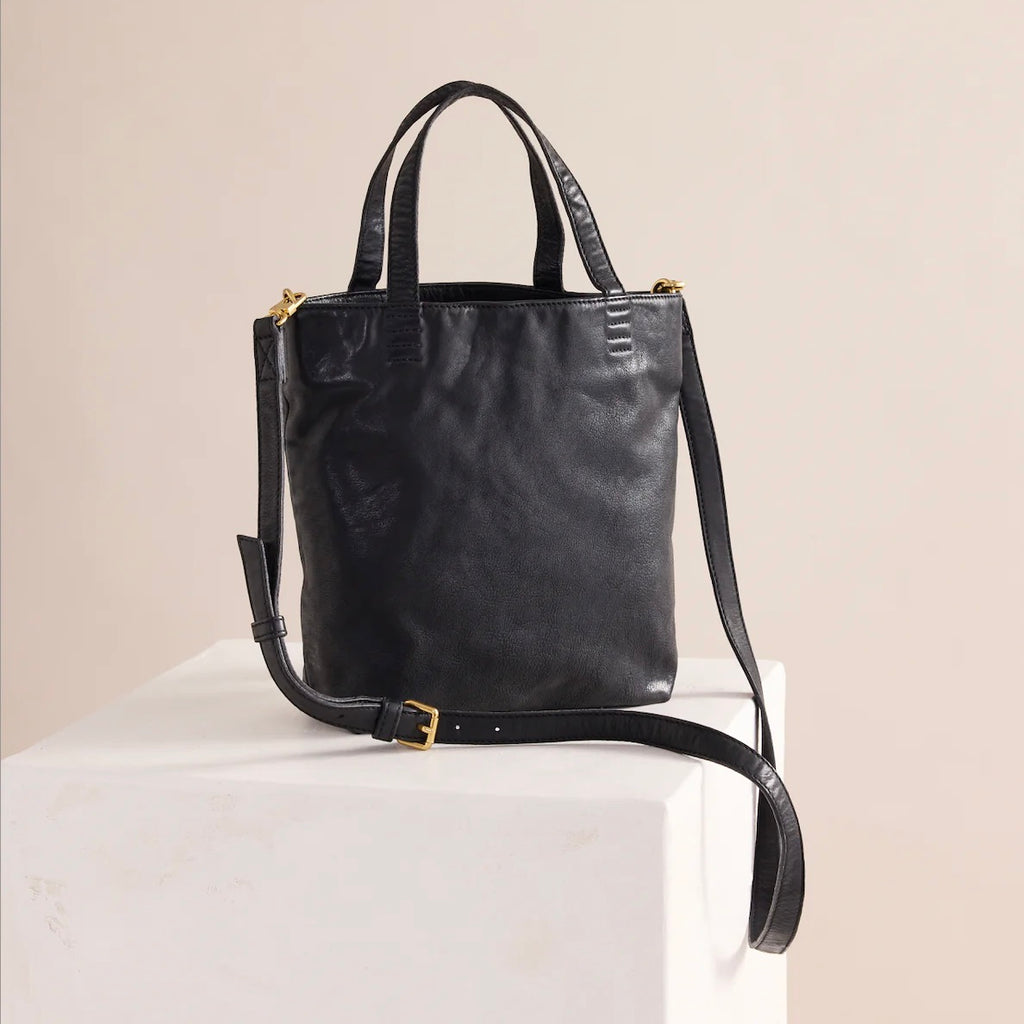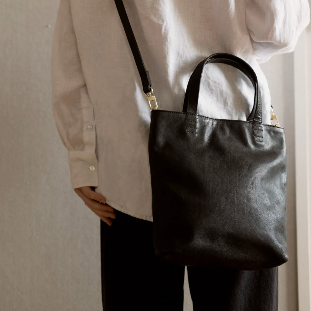 The Mini Shopper is a medium sized handbag that can be worn crossbody or carried by the top handles. It is made from tumbled leather and lined with taupe cotton. The Mini Shopper has an inside zip pocket and top magnet closure. It has an adjustable detachable long handle, and two short carry handles.