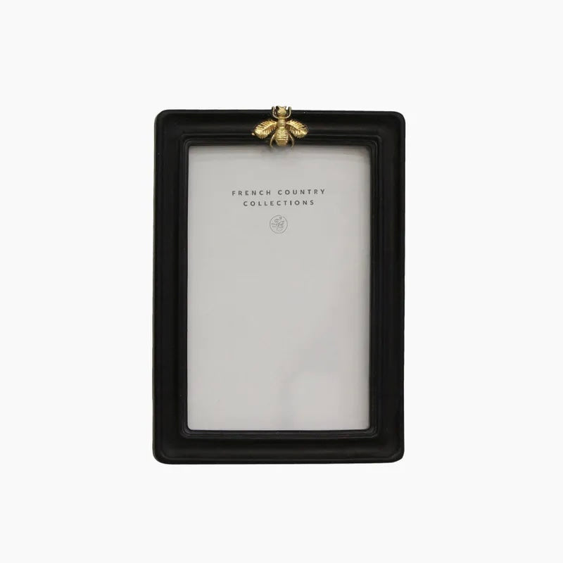 Black round edge frame with regal gold bee.
