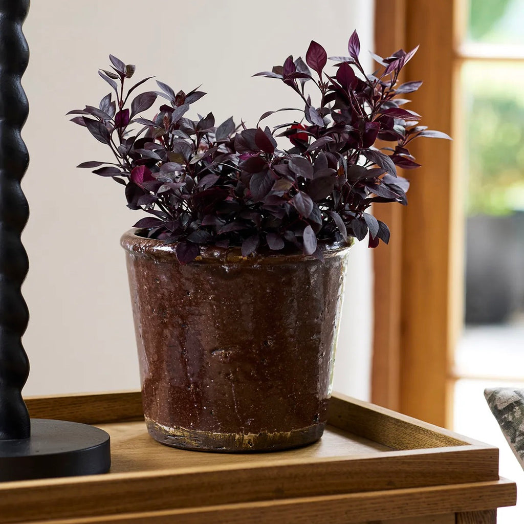 Rustic glazed terracotta pot in a brick brown colour makes an ideal earthy accent to your home or garden.