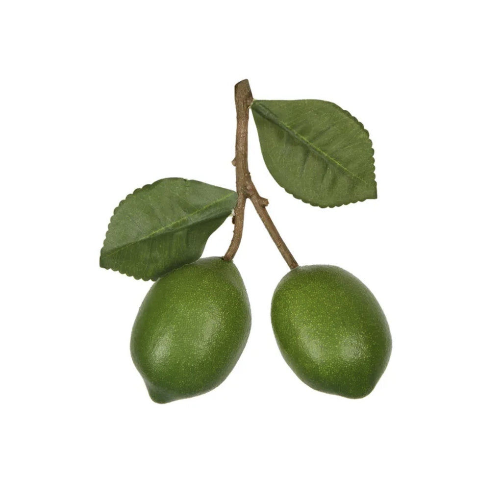 Our lime branch features two beautifully shaped limes in a zesty green, with surrounding leaves on a brown branch. The realistic limes have a wonderful texture and are speckled with subtle light green throughout to ensure they are virtually indistinguishable from the real thing. Surrounding the limes are polyester green leaves with jagged edges and brown branches to add to the realism.